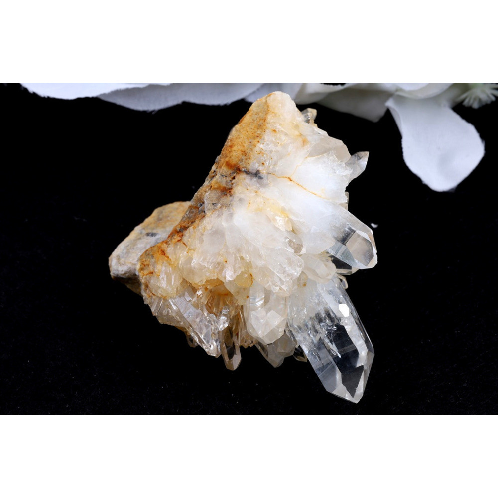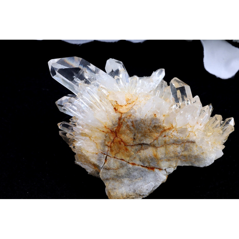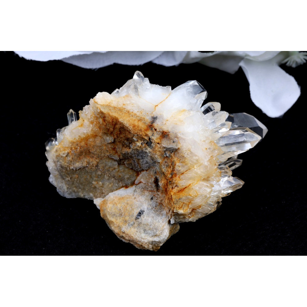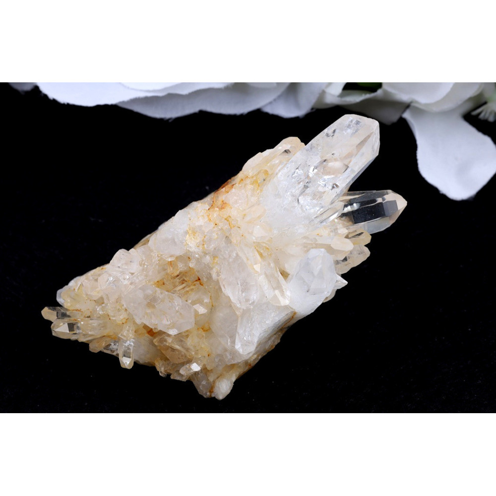 Tento unikátní kus představuje přírodní křišťálovou drúzu se zajímavou kompozicí krystalů. Drúza se vyznačuje průhlednými až mléčně bílými krystaly s výbornou čirostí a leskem. Některé části drúzy obsahují teplé hnědavé až medově oranžové inkluze, které vytvářejí zajímavý kontrast s čirými krystaly. Krystaly rostou v různých úhlech a vytváří dynamickou, prostorovou kompozici. Povrch má přírodní, surový charakter s dobře vyvinutými krystalickými plochami a výraznými hroty. Celková struktura drúzy působí pevně a kompaktně.
