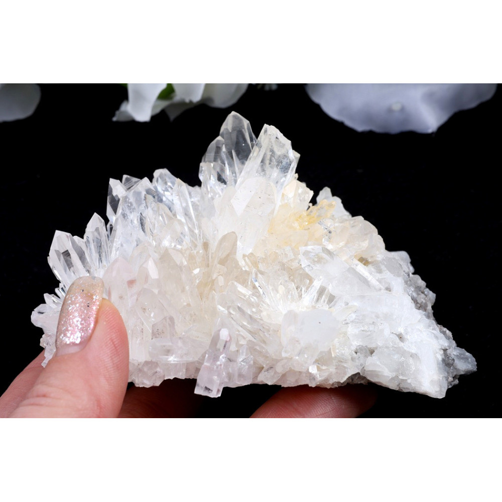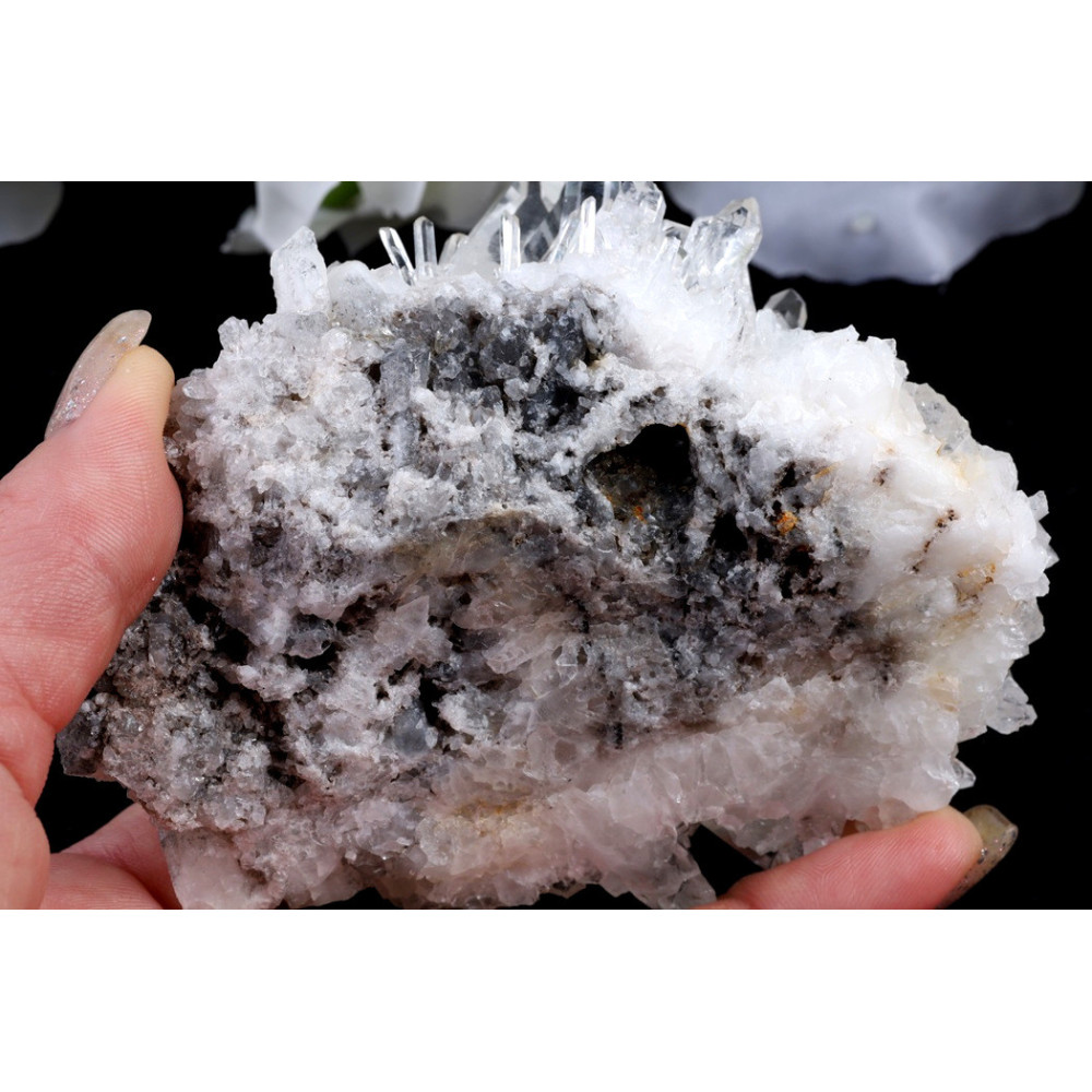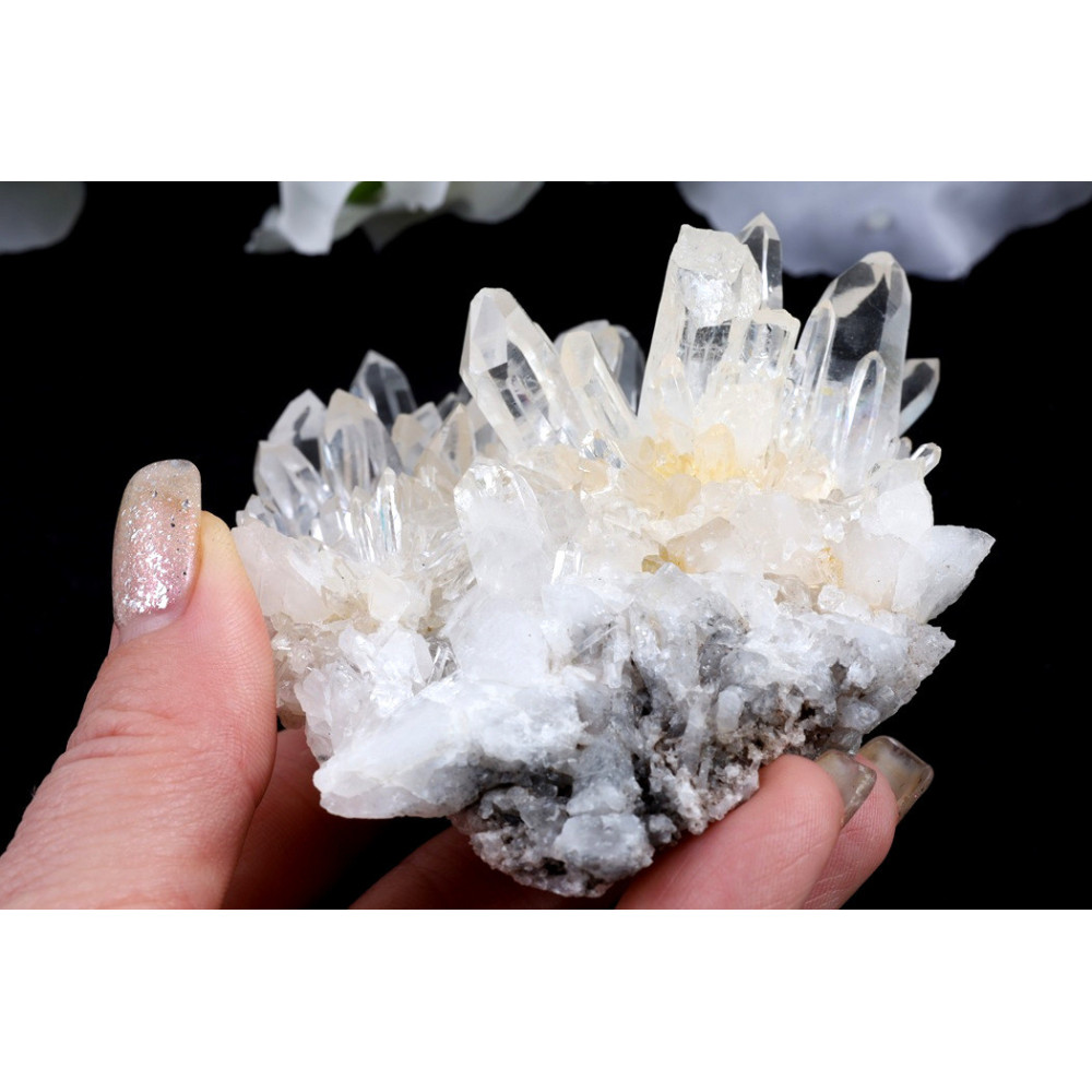 Tento impozantní kus představuje velkolepou křišťálovou drúzu s četnými průsvitnými až mléčně bílými krystaly. Kompaktní shluk se pyšní množstvím dokonale vyvinutých krystalů se špičatými vrcholy, které vytváří harmonickou kompozici. Průsvitné partie odhalují vnitřní čistotu a energii kamene. Vzhledem ke svým robustním rozměrům 9,5 cm x 6,8 cm x 5,5 cm a hmotnosti 224 g se jedná o skutečně majestátní exemplář vhodný pro náročné sběratele.