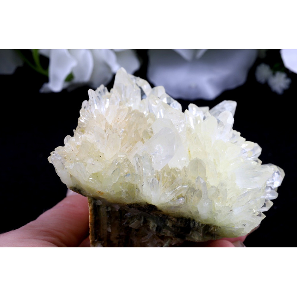 Tento jedinečný kus představuje nádhernou kulovitou křišťálovou drúzu se skvostným lesklým povrchem. Povrch drúzy je hustě pokryt drobnými krystalickými hroty, které vytvářejí kompaktní a harmonickou strukturu. Krystalky jsou průhledné až mléčně bílé barvy s krásným skelným leskem, který přitahuje světlo a vytváří jemné odlesky. Spodní část kamene tvoří tmavší přírodní základna, která dodává drúze přirozený a autentický vzhled. Celková forma je kulovitá s čistým a estetickým vzhledem.