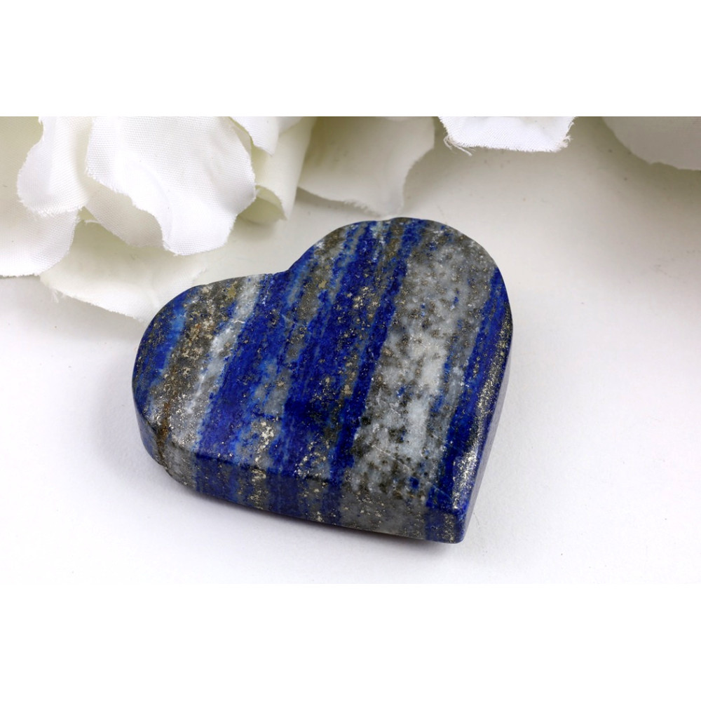 Tento konkrétní kus Lapis Lazuli je mistrovským dílem přírody, vytvarovaným do něžného srdce. Jeho povrch je leštěný do vysokého lesku, který nádherně podtrhuje bohatou škálu modrých odstínů – od syté inkoustově modré až po světlejší tóny, jež se prolínají v jedinečných pruzích a vzorech. Uvnitř modrého plátna jsou jasně viditelné inkluze zlatavého pyritu, které se třpytí jako hvězdný prach, a jemné bílé žilky kalcitu, jež dodávají celku hloubku a rozmanitost. Okraje srdce jsou pečlivě zaoblené, což umocňuje jeho příjemný a harmonický tvar.