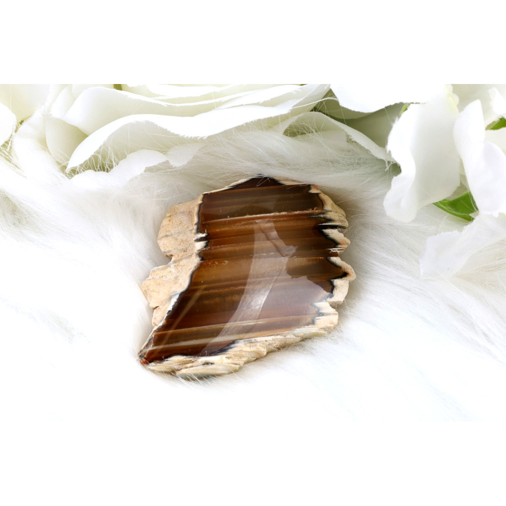 Tento konkrétní, ručně vybraný řez ze Sumatra achátu č.1295 okouzlí svou hlubokou, téměř čokoládově hnědou barvou, která přechází do karamelových a béžových tónů. Povrch je dokonale leštěný do vysokého lesku, což podtrhuje jeho jemnou, avšak bohatou vnitřní kresbu s náznaky vrstvení, typickou pro acháty. Okraje kamene jsou zachovány v přírodním, neopracovaném stavu, což dodává kusu autentický a rustikální vzhled. Jedná se o originální kus s krásně kontrastním spojením leštěného jádra a přírodní, texturované kůry.