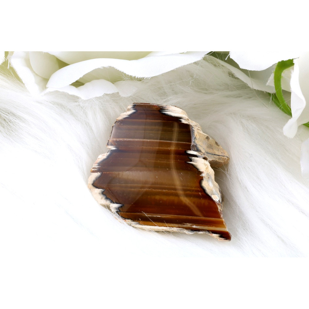 Tento nádherný leštěný řez achátu ze Sumatry č.1298 představuje fascinující hru barev a textur. Dominují mu teplé hnědé a zemité tóny, které se prolínají s jemnějšími krémovými a světlejšími pásy, vytvářejícími organické, vlnité vzory. Jedna strana je dokonale vyleštěná do vysokého lesku, který zvýrazňuje hloubku a detail kresby, zatímco druhá strana si zachovává svůj přírodní, surovější vzhled, s nepravidelnými okraji a jemnou strukturou. Díky kontrastu lesklého a matného povrchu je tento originální kus vizuálně velmi zajímavý a lákavý.