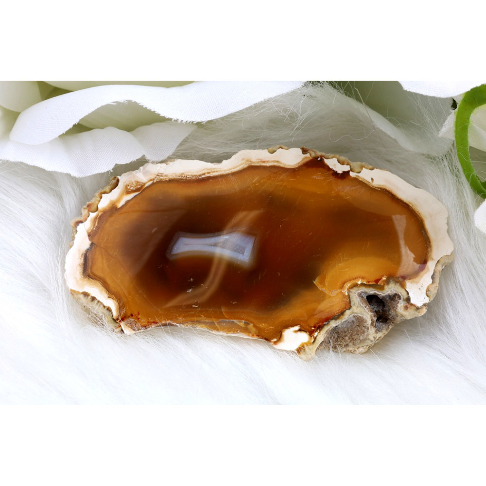 Tento nádherný leštěný řez sumaterského achátu č.1300 odhaluje fascinující vnitřní svět kamene. Jeho centrum dominuje sytě oranžovými a teplými hnědými tóny, které přechází do karamelových odstínů a vytváří efekt hluboké, průsvitné laguny. Uprostřed je patrný jemný bílý až šedavý pruh, který podtrhuje unikátní geologickou kresbu. Okraje řezu zdobí krémově bílá vrstva, která se směrem k vnější, surové části kamene mění v drsnou, pórovitou strukturu přírodního achátu. Lesklý povrch leštěné části zrcadlí světlo a zvýrazňuje bohatost barev a detailů, čímž z něj činí skutečně originální a poutavý sbírkový kousek.