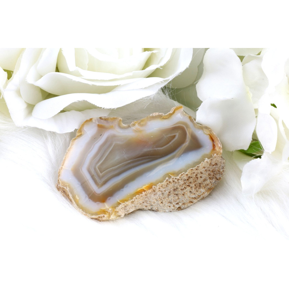 Tento konkrétní leštěný řez achátu je nepravidelného, organického tvaru. Jedna strana je dokonale vyleštěná do hladkého, lesklého řezu, zatímco druhá si zachovala svou původní, drsnou a texturovanou podobu. Leštěná plocha odhaluje okouzlující vrstvenou kresbu achátu s převládajícími tóny krémově bílé, světle hnědé až karamelové a průsvitné šedé. Vrstvy se soustředí kolem oválného středu, vytvářející jemné prstence. Okraje leštěného řezu jsou ohraničeny tenkým, jasně bílým pruhem, který zvýrazňuje jeho eleganci. Surová část má zrnitou texturu a pískovou barvu, která krásně kontrastuje s uhlazeným leskem vnitřního řezu, podtrhující jeho přírodní původ a jedinečnost.