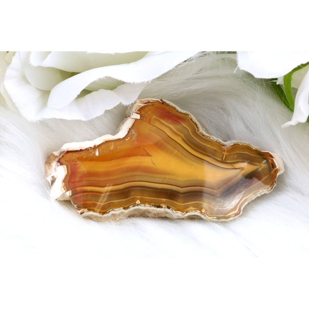 Tento konkrétní, ručně vybraný leštěný řez z Sumatra achátu č.1306 je vizuální symfonií teplých zemních tónů. Jeho dokonale vyleštěný povrch odhaluje fascinující vrstvy, které přecházejí od mléčně bílé a krémové na vnějších okrajích k bohatým odstínům sytě oranžové, medově hnědé a temně čokoládové směrem k jádru. Každá vrstva je precizně ohraničena a tvoří unikátní, organickou kresbu připomínající prstoklad přírody. Povrch kamene se nádherně leskne, zatímco surové, nepravidelné okraje dodávají celku autentický, přírodní charakter. Z druhé strany kámen ukazuje svou surovou krásu s přirozenou, netknutou texturou.