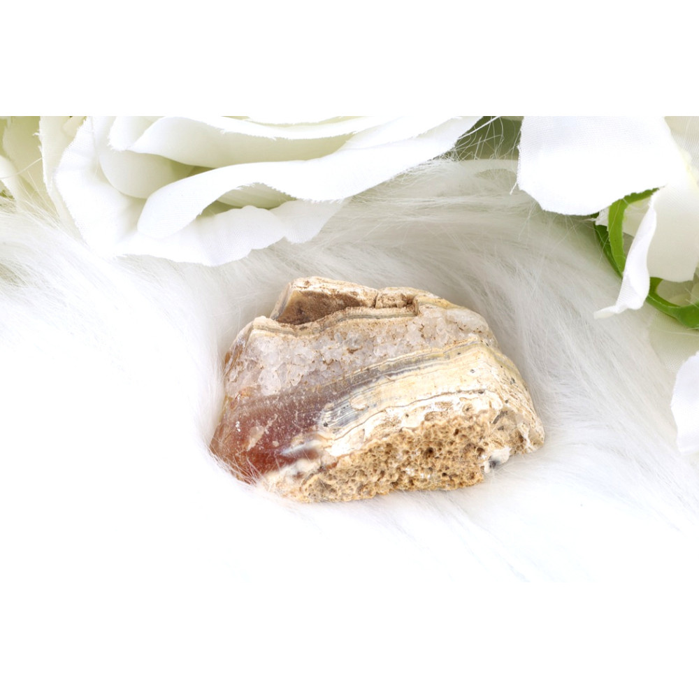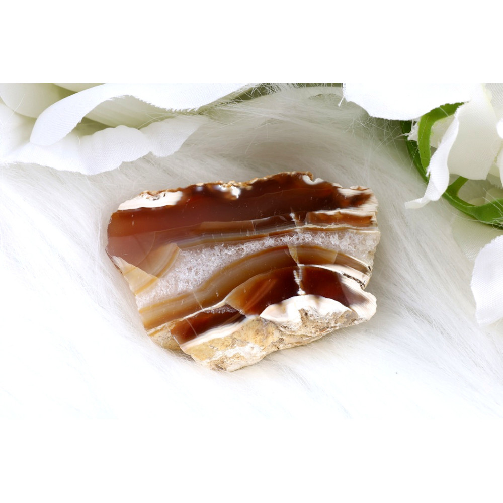 Před vámi leží fascinující leštěný řez z achátu, který ztělesňuje mistrovské dílo přírody. Jeho povrch odhaluje nádherně vrstvenou kresbu, kde se střídají krémově bílé, téměř průsvitné pásy s bohatými odstíny hnědé a rezavé. Některé vrstvy jsou sytě hnědé, jiné jemnější, vytvářející plynulý, organický vzor. Okraje tohoto jedinečného kusu si zachovaly svou původní, drsnější texturu, která kontrastuje s dokonale vyleštěným povrchem. V některých světlejších oblastech lze pozorovat jemné krystalické inkluze, které dodávají kameni další rozměr. Tento **originální kus** je vizuálním zážitkem a důkazem nekonečné kreativity Země.