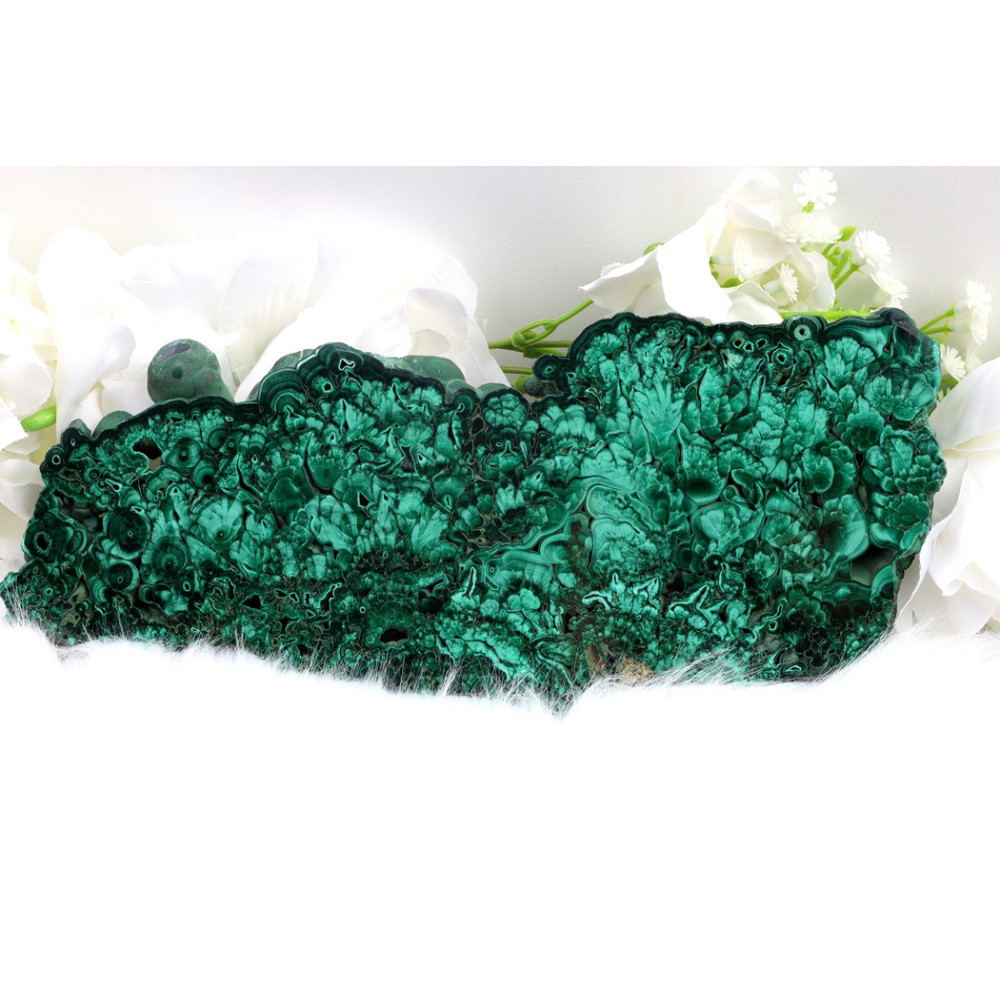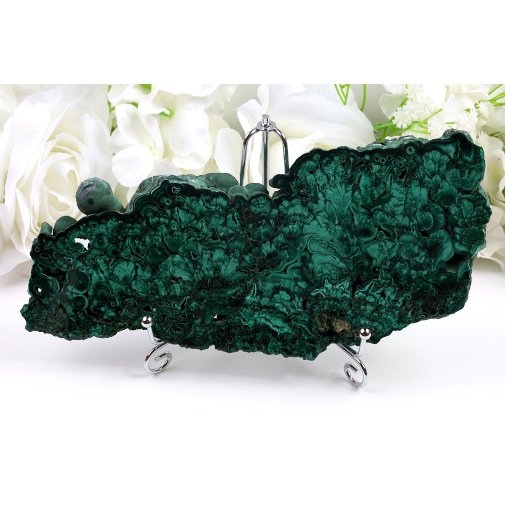 Plátek malachitu najde uplatnění jako výjimečný dekorativní prvek do interiéru, kde vnese bohatou zelenou energii a přírodní atmosféru. Je ideální pro umístění na pracovní stůl, poličku nebo jako součást minerální sbírky. Může sloužit jako osobní meditační kámen, při jehož kontemplaci lze nalézt klid a soustředění. Díky své velikosti je také vhodný jako jedinečný dárek pro milovníky minerálů a přírodních krás.