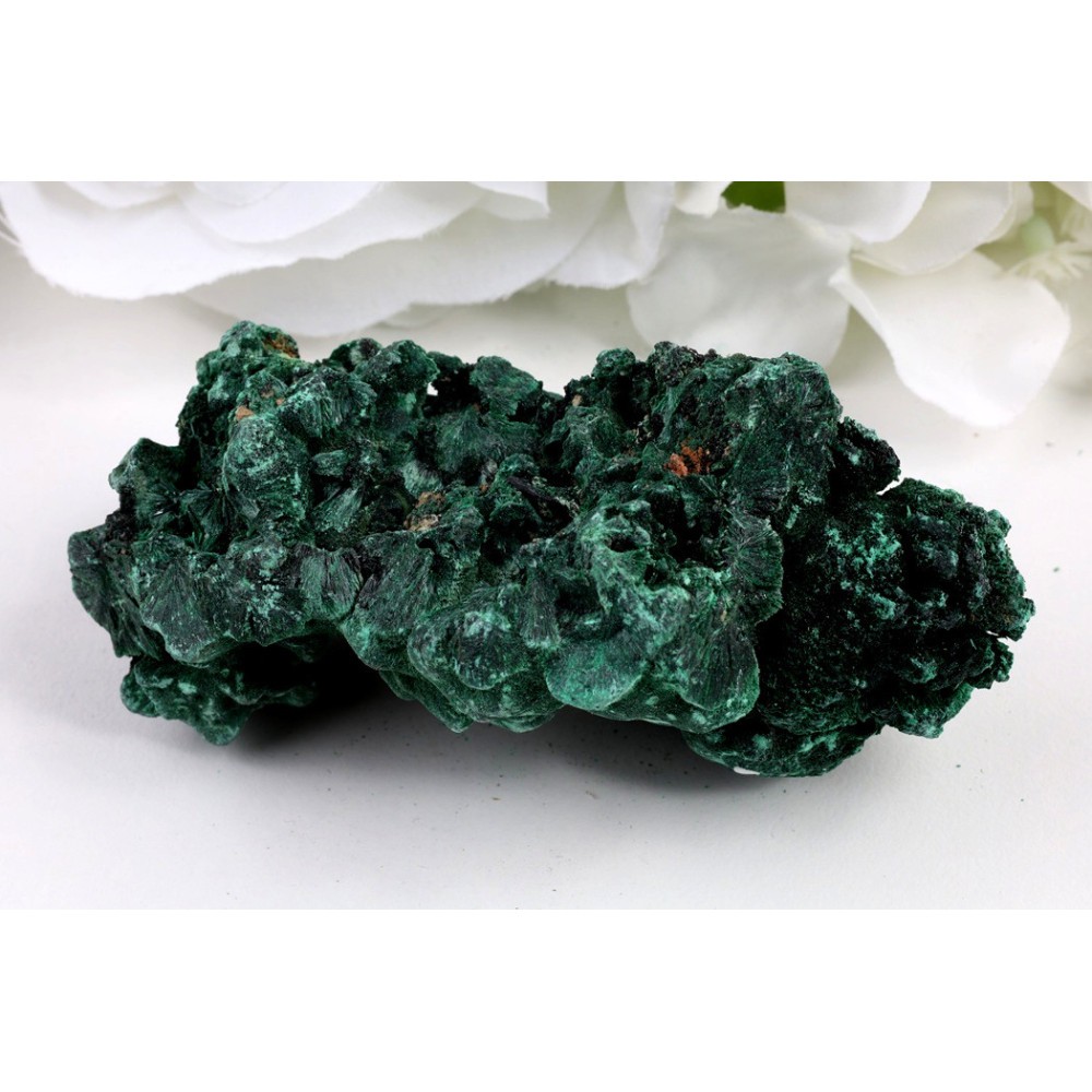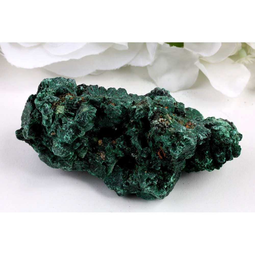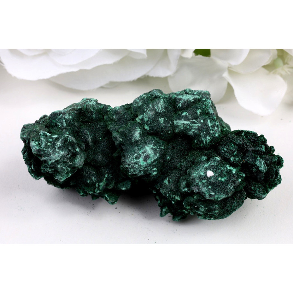 Sametový malachit je mimořádně vzácná odrůda malachitu, která se vyskytuje převážně v Kongu. Tento minerál je v tradici považován za mocný kámen transformace a vnitřní síly. Věří se, že podporuje harmonii, pomáhá při hledání životní rovnováhy a přináší duševní klid. Jeho hluboká zelená barva je odedávna spojována s přírodou, obnovou a růstem. Sametový malachit je vysoce ceněn sběrateli po celém světě pro svůj unikátní matný povrch, který připomíná jemný samet, a intenzivní zbarvení.