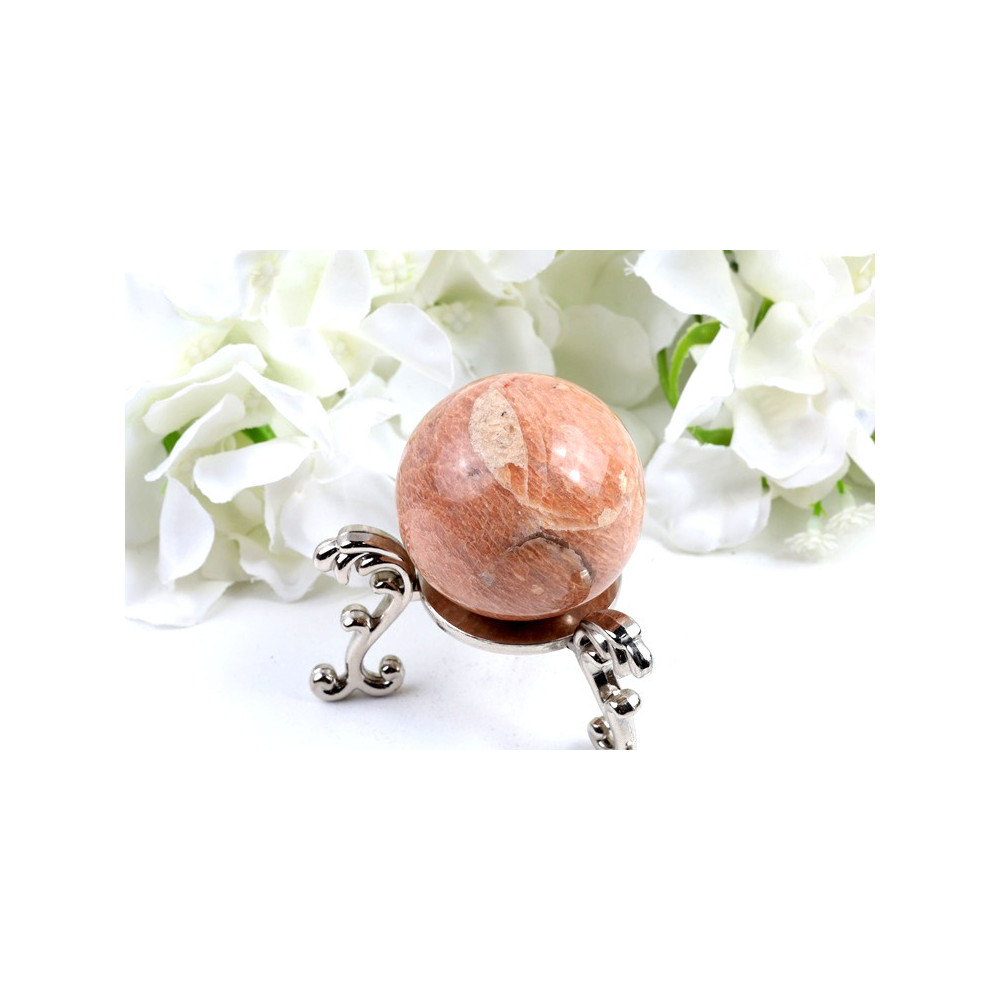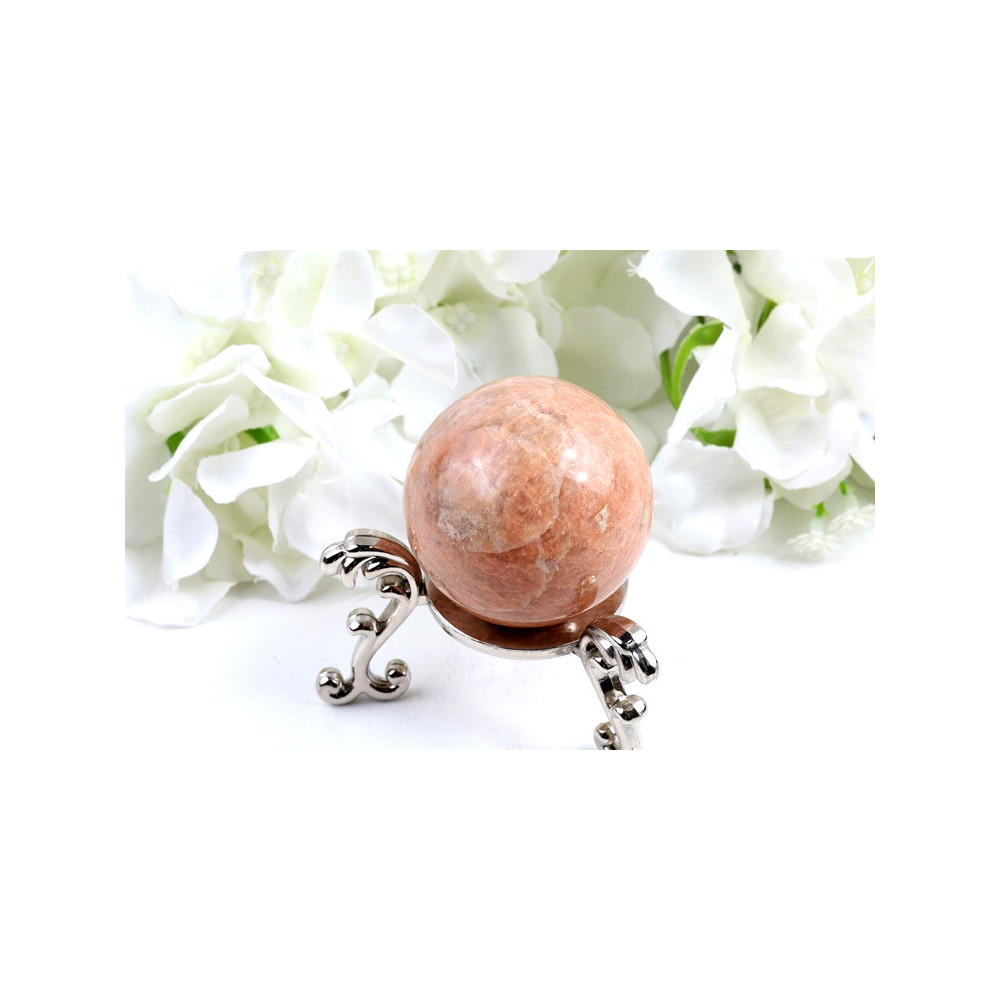Tato kompaktní koule o průměru 46 mm vyniká jemným korálově oranžovým až broskvovým odstínem, který evokuje teplé sluneční paprsky a harmonii přírody. Povrch kamene je pečlivě vyleštěn do dokonalého lesklého povrchu s hedvábným až perleťovým odleskem. Kámen je částečně průsvitný, což mu dodává na hloubce a přirozenosti. Po celém povrchu se vine jemné žilkování a nepravidelné přírodní struktury, které jsou charakteristické pro tento madagaskarský měsíční kámen a činí každý kus naprosto jedinečným. Tvar koule je dokonale kulatý s hladkým povrchem, který příjemně padne do dlaně.
