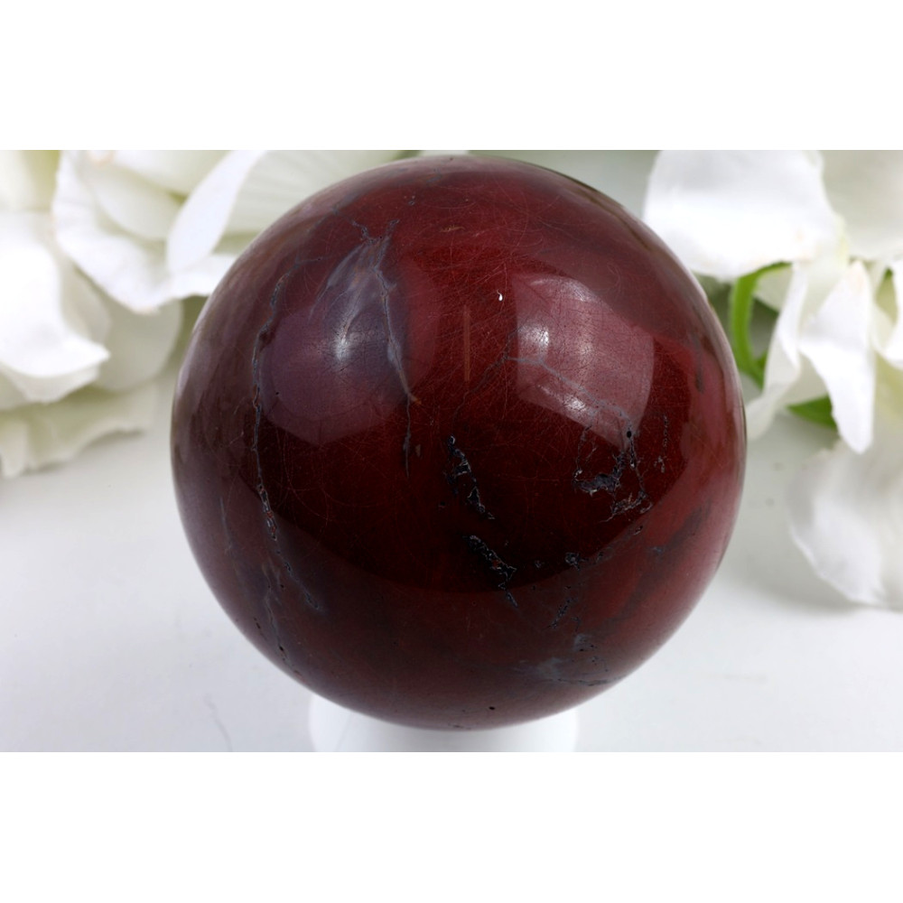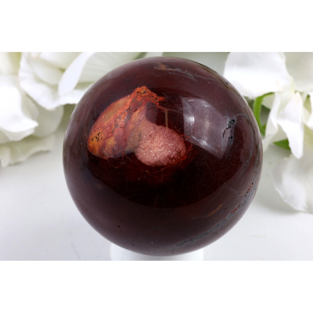 Tato fascinující koule z mookaitu č.1387 se pyšní hlubokými, sytými odstíny tmavě červené a bordó, které přecházejí do zemitých tónů okru a krémové. Na pečlivě leštěném povrchu vynikají jedinečné inkluze a kresby, které vytvářejí dojem abstraktního umění. Jedna část koule odhaluje surovější, až drúzovitý povrch uvnitř, který je nádherným kontrastem k jinak hladkému a lesklému provedení.