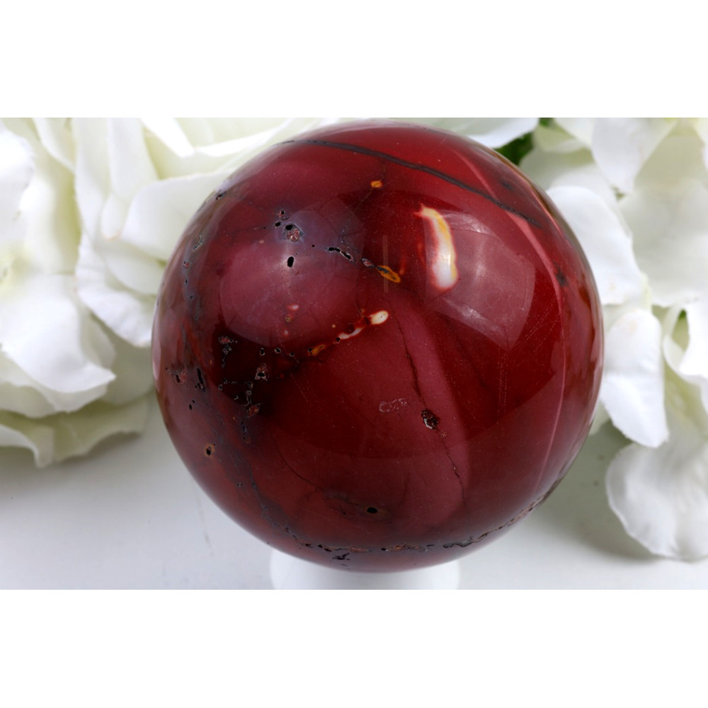 Tato nádherná koule z mokaitu, číslo 1391, se pyšní bohatou škálou zemitých tónů, které přecházejí od sytě rudohnědé až po hlubokou vínovou barvu. Její povrch je mistrně leštěný do vysokého lesku, který umožňuje světlu tančit po jejím hladkém obvodu a odhalovat jemné páskování a kresby. Na některých místech se objevují světlejší, krémové až žlutavé inkluze, které vytvářejí fascinující kontrast a dodávají kameni jeho jedinečný charakter. Pohled na tuto kouli je jako pohled do srdce australské pouště, plné skrytých krás a prastarých příběhů.