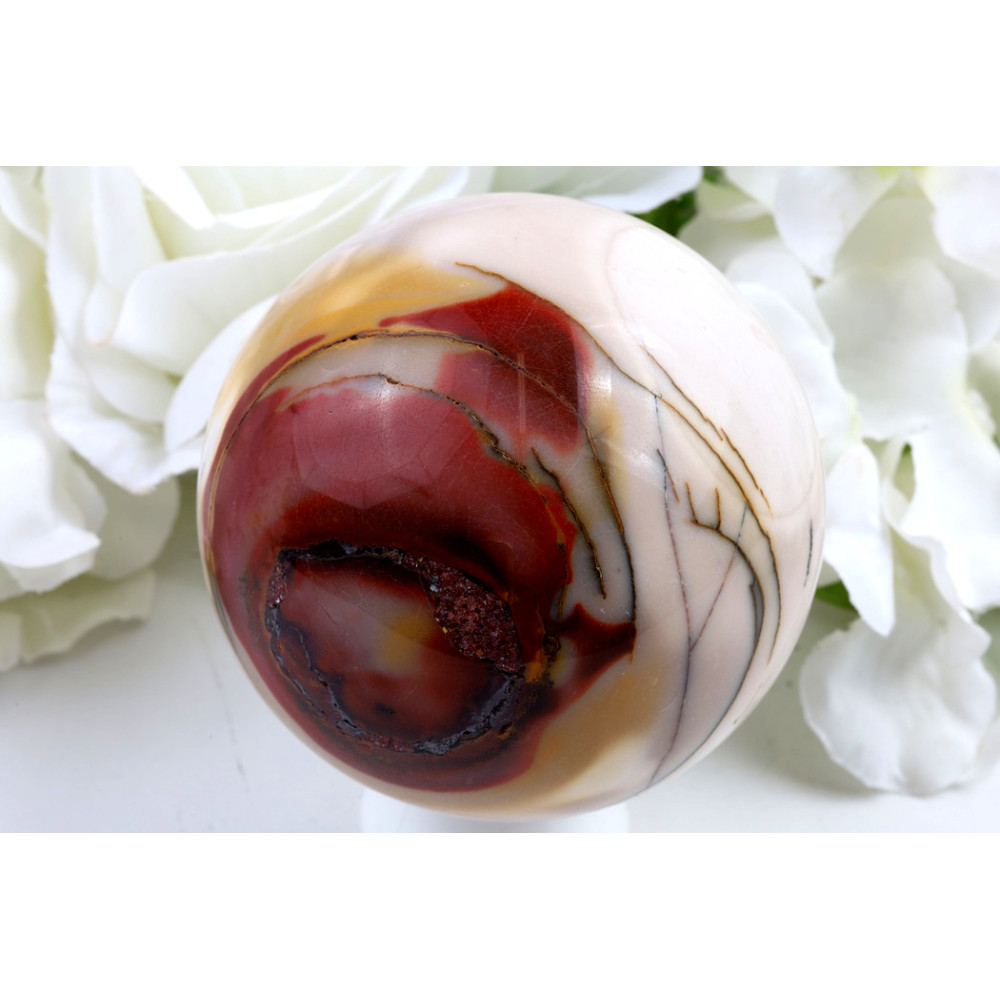 Tato nádherná mokait koule pochází z Austrálie, konkrétně z oblasti západního pobřeží, kde miliony let geologických procesů formovaly tuto jedinečnou horninu. Hluboko v zemi, pod vrstvami prastaré půdy, vznikala působením vody a minerálů fascinující barevná paleta, která dnes zdobí tento kámen. Každý kus mookaitu tak nese v sobě ozvěny dávné australské krajiny, energie pouště a síly Země, která se projevuje v jeho sytých a teplých tónech.