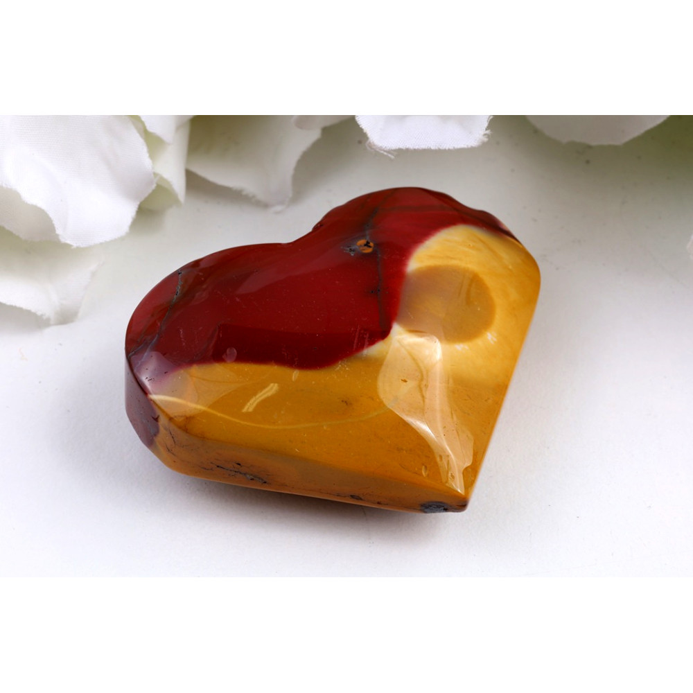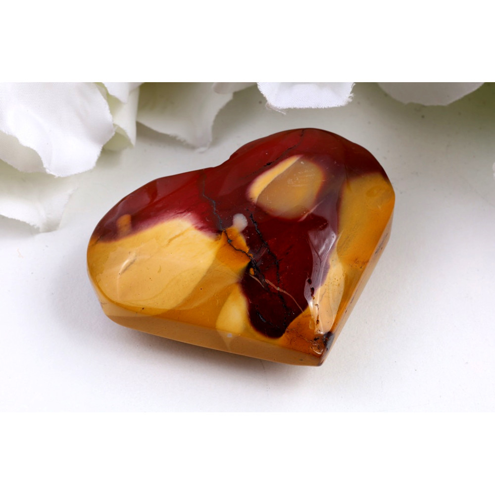 Tento konkrétní kus srdce z mokaitu č. 1543 fascinuje svou bohatou paletou zemitých barev, které se vzájemně prolínají v nepravidelných, avšak harmonických tvarech. Dominují zde syté odstíny karmínově červené a okrově žluté, které vytvářejí dojem hluboké energie. Místy se objevují tmavší, až černé inkluze či žilky, které dodávají kameni na jedinečnosti a zdůrazňují jeho přírodní původ. Povrch je precizně vyleštěný, což umocňuje lesk barev a hladkost na dotek.