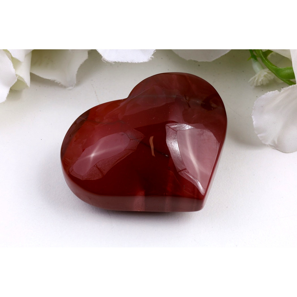 Toto nádherné leštěné srdce z mokaitu č. 1546 uchvátí hlubokou vínově červenou barvou, která se místy prolíná s odstíny sytě rudé a jemnými okrovými tóny. Povrch kamene je mistrně vyleštěn do vysokého lesku, který nechává vyniknout fascinující pruhování a vnitřní kresbu, připomínající starobylé vrstvy země. Všimněte si jemných barevných přechodů, které dodávají každé straně srdce jedinečný charakter.