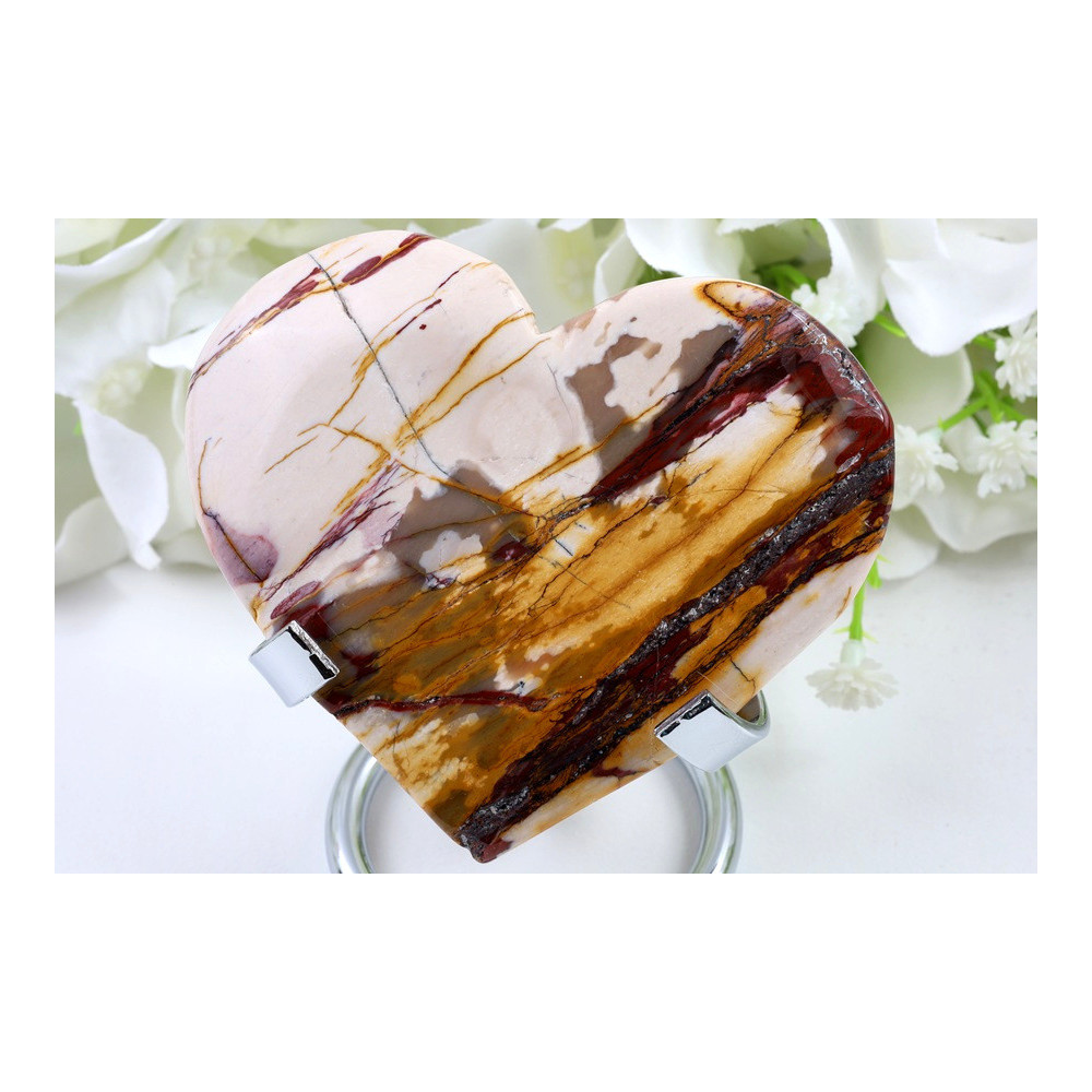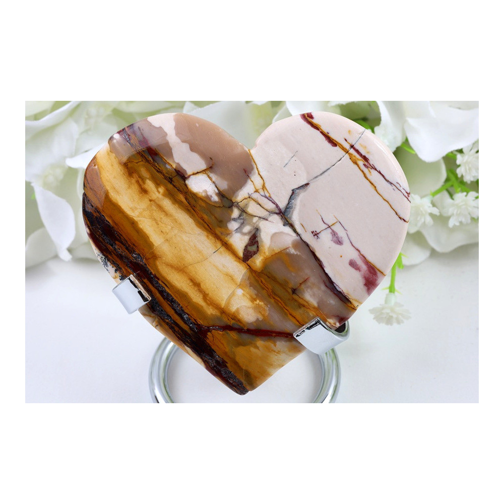 Tento nádherný kus mokaitu přitahuje pozornost svou výraznou pruhovanou kresbou v teplých zemitých tónech. Povrch je dokonale vyleštěn do vysokého lesku, který zvýrazňuje jemné přechody barev od světlých krémových odstínů přes zlatavě hnědé až po sytě červenohnědé tóny. Přírodní pruhování vytváří jedinečný vzor, který dodává tomuto srdci neopakovatelný charakter. Leštěný povrch odráží světlo a zdůrazňuje hřejivé zemité barvy charakteristické pro mokait z Číny.