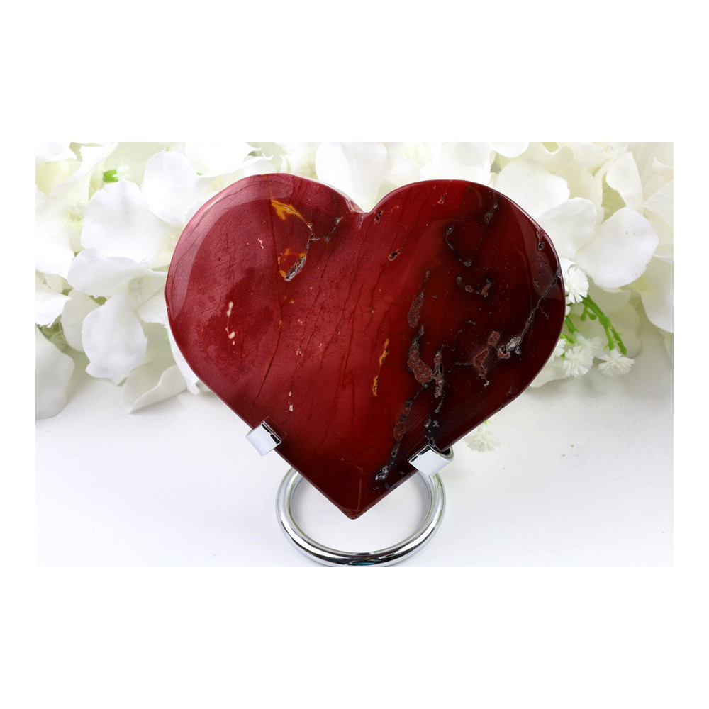 Toto mokaitové srdce se vyznačuje hlubokým sytým červeným zbarvením s teplými bordó tóny, které působí luxusně a elegantně. Povrch kamene je pečlivě vyleštěn do vysokého lesku, díky čemuž krásně odráží světlo a vytváří na povrchu výrazné odlesky. Srdcový tvar je pravidelný a symetrický, s hladkými oblými hranami. Barevnost je jednotná a homogenní, což podtrhuje vysoce kvalitní leštění a přírodní charakter tohoto konkrétního kusu. Celkový vzhled je noblesní a působivý.