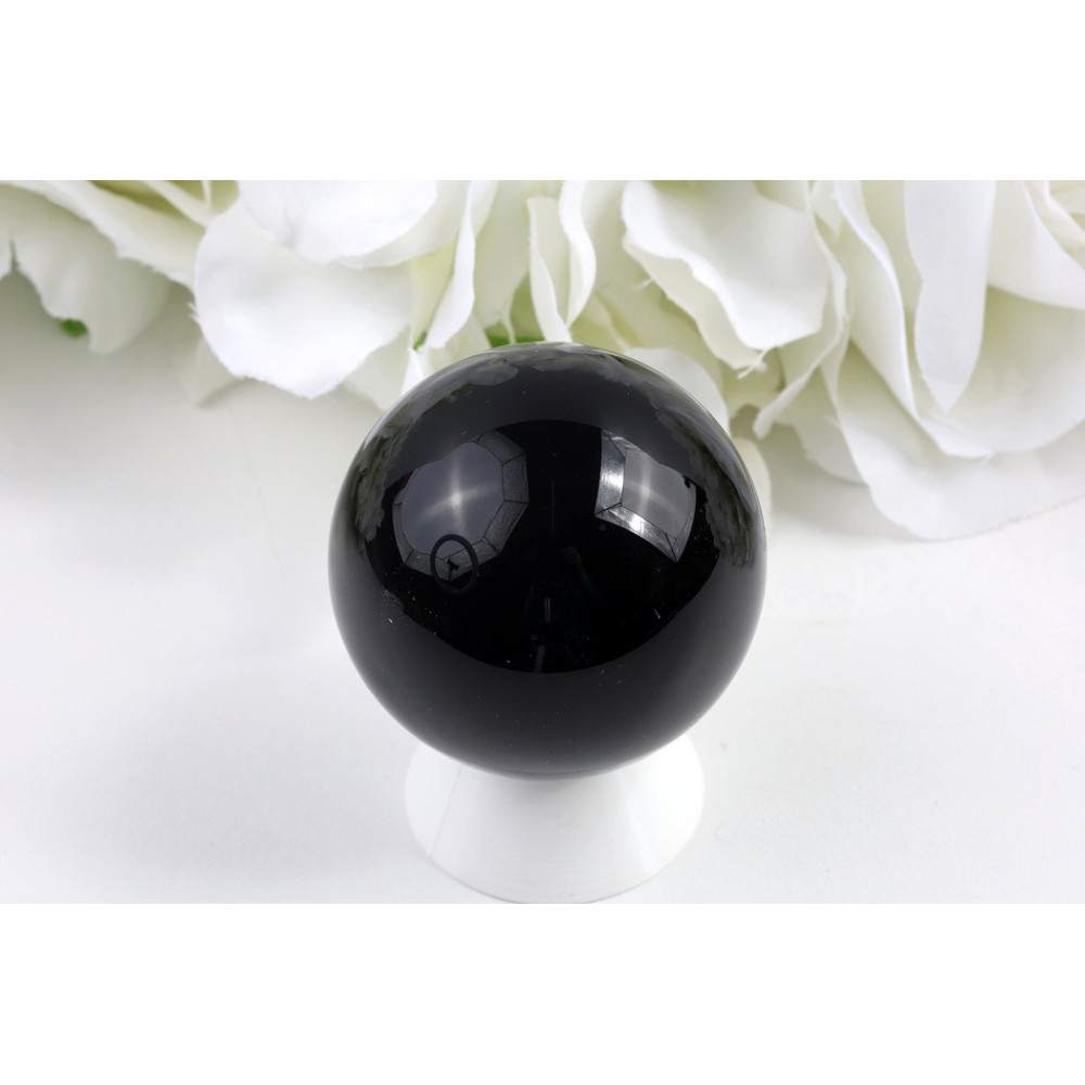 Tato koule černého obsidiánu zaujme svým intenzivním tmavým leskem a dokonale vyleštěným povrchem. Hladká černá plocha odráží světlo a vytváří působivé odlesky, které podtrhují hlubokou černou barvu vulkanického skla. Jedná se o precizně opracovaný kus s pravidelným kulovitým tvarem a lesklým povrchem bez viditelných nedokonalostí.