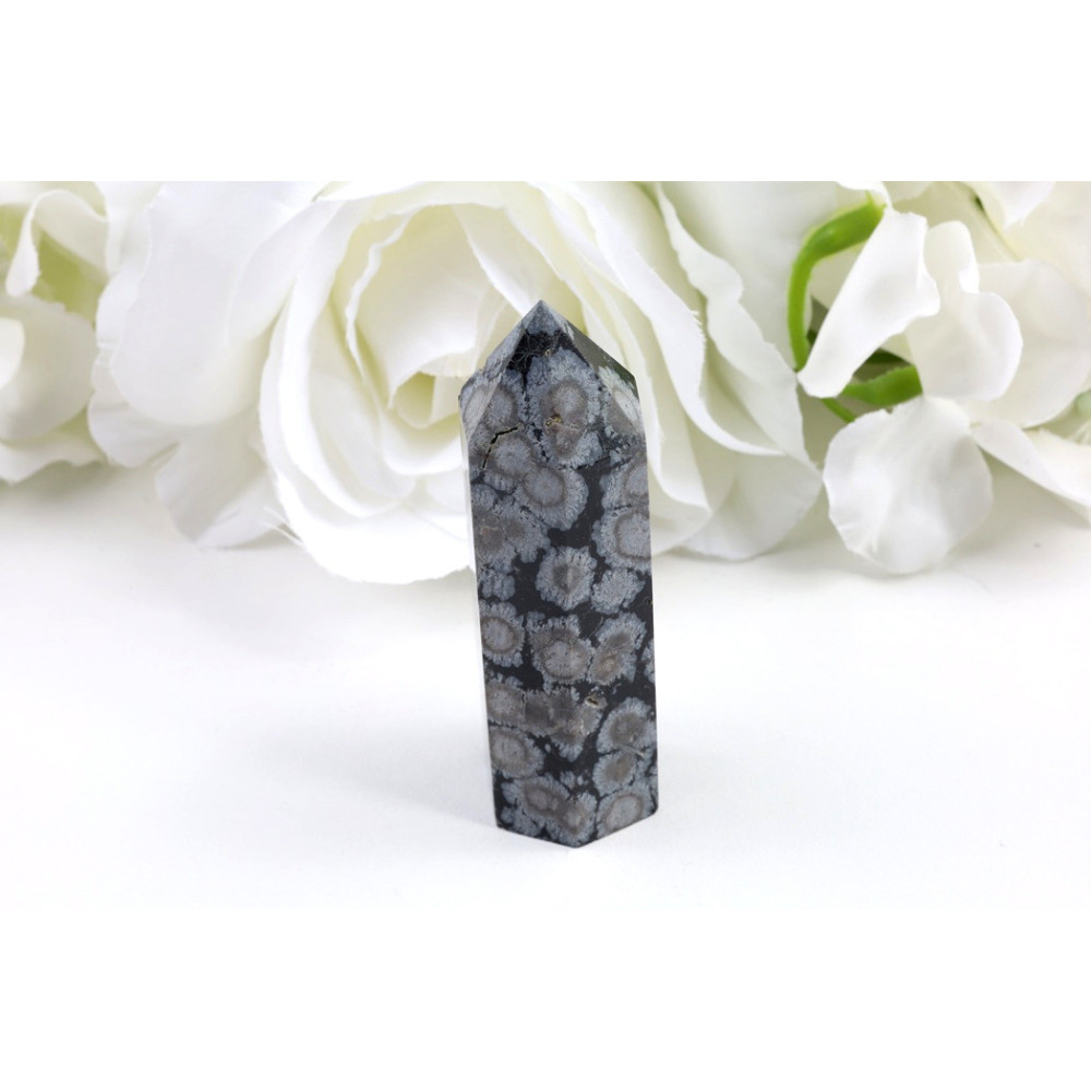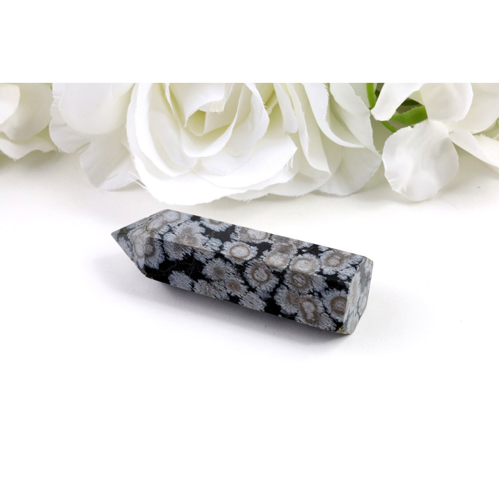 Tento kompaktní obelisk z vločkového obsidiánu představuje harmonický spojení černé sopečné síly a bílých krystalických vloček. Kámen má pravidelný obeliskový tvar s pyramidální špičkou a pečlivě leštěný povrch, který krásně zvýrazňuje kontrast mezi hlubokou černou základnou a jemnými bílými inkluzemi připomínajícími sněhové vločky. Menší rozměry činí z tohoto kusu ideálního společníka pro meditaci nebo pracovní prostředí.