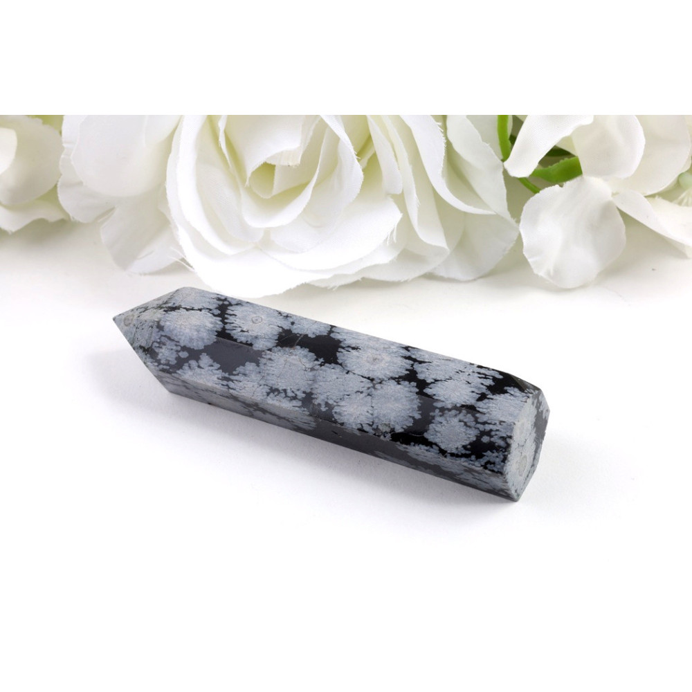 Vločkový obsidián je přírodní vulkanické sklo vzniklé rychlým ochlazením lávy. Charakteristické bílé vločky jsou tvořeny krystalky cristobalitu. V tradičním pojetí je tento minerál ceněn pro svou schopnost podporovat vnitřní klid a harmonii. Je považován za kámen, který pomáhá v sebereflexi a meditaci, podporuje duševní vyrovnanost a pomáhá při hledání životní rovnováhy. Tradičně je spojován s ochranou před negativními energiemi a podporou osobního růstu.