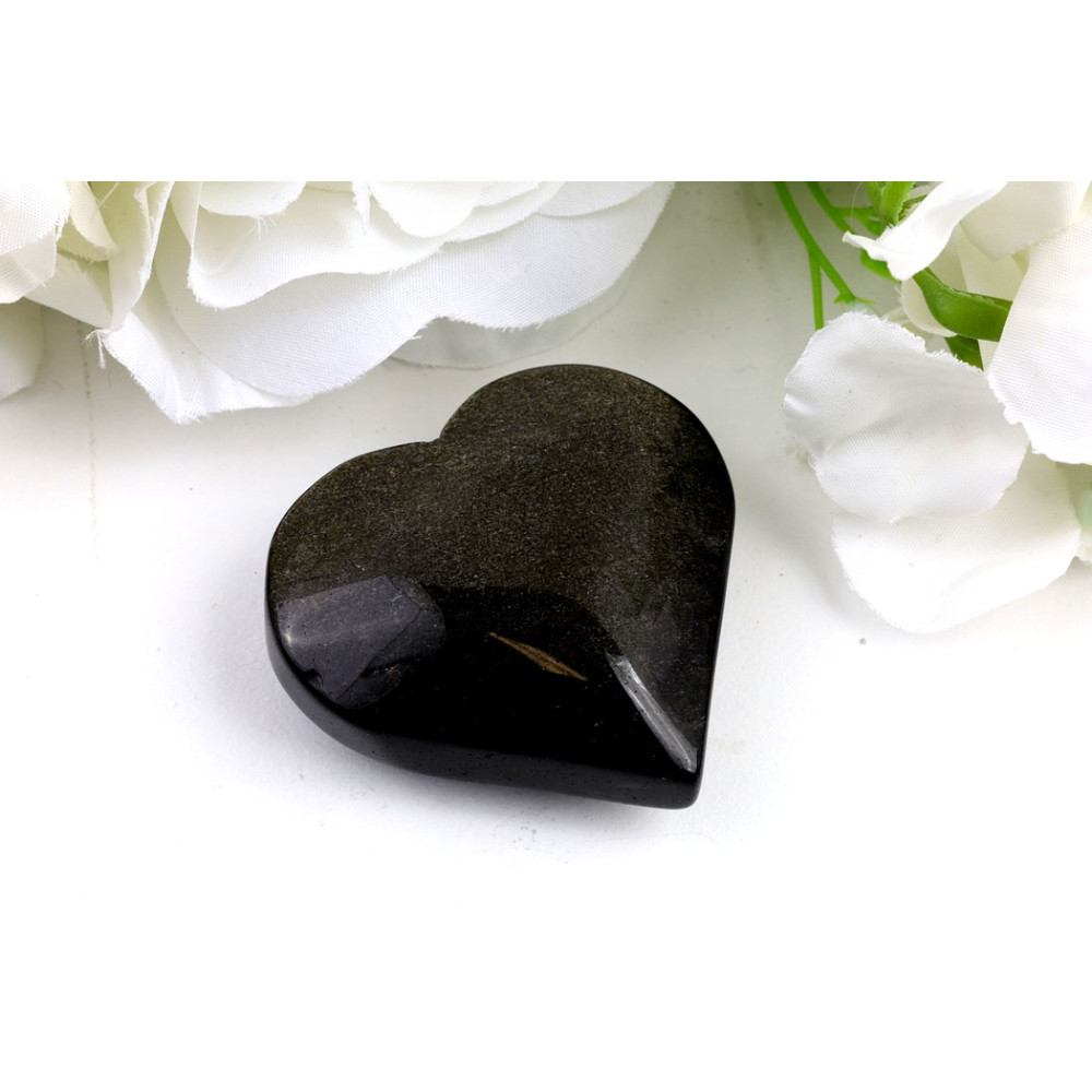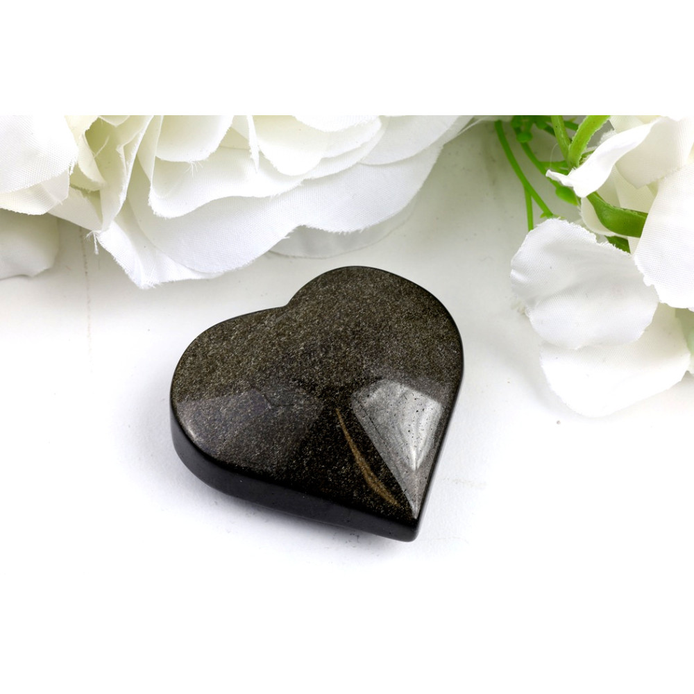 Toto nádherné srdce z zlatého obsidiánu č. 1206 uchvátí svou sytě černou barvou, která je protkána jemnými, zlatavými odlesky. Ty se při pohybu kamene roztančí na jeho dokonale leštěném povrchu a vytvářejí tak úchvatný optický efekt. Tvar srdce podtrhuje jeho jemnost a dodává mu pocit lásky a harmonie. Na povrchu nejsou viditelné žádné výrazné inkluze nebo dutinky, což podtrhuje jeho čistou a elegantní estetiku. Jde o skutečně jedinečný a ručně vybraný originální kus, který vynikne v každé sbírce.
