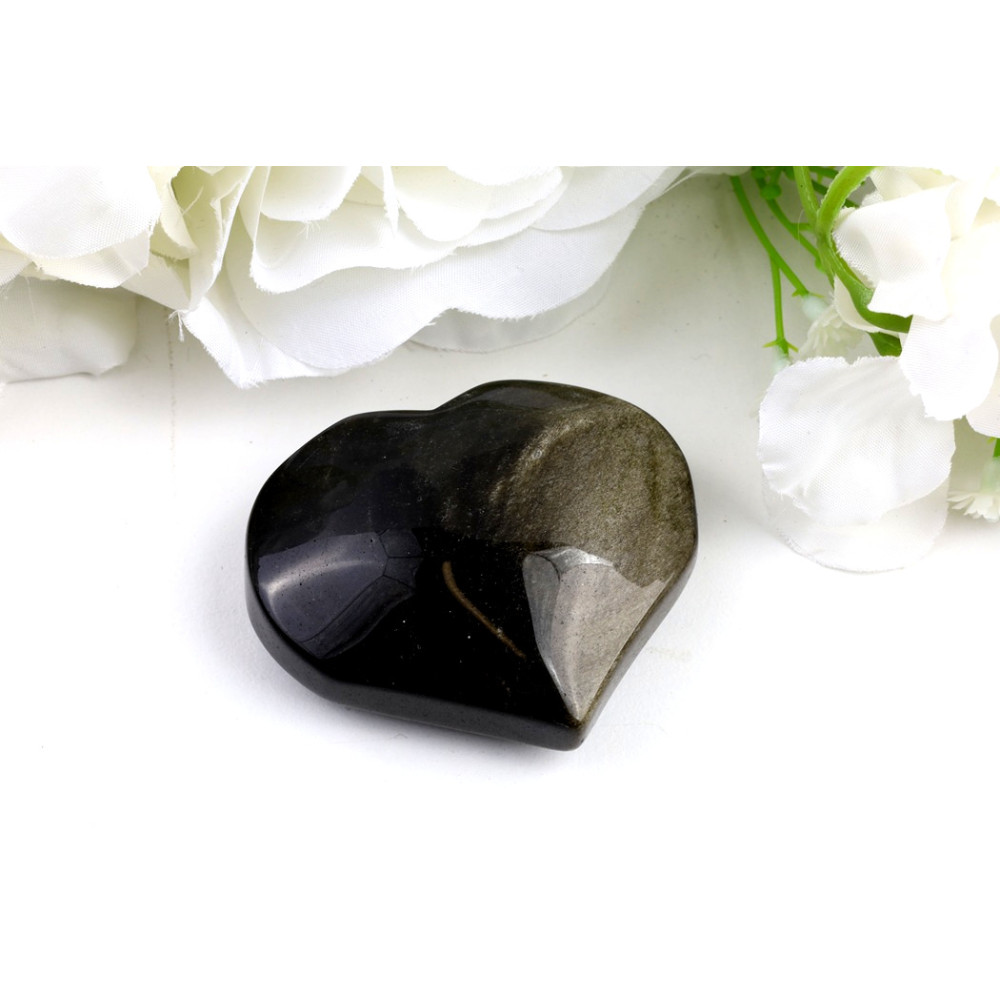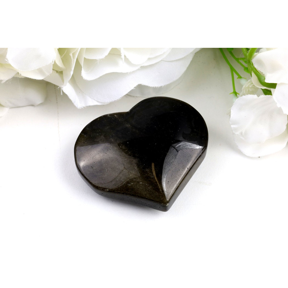 Toto srdce ze zlatého obsidiánu č. 1211 zaujme svou hlubokou, téměř inkoustově černou barvou, která se při dopadu světla promění v nádherné zlatavé odlesky. Tyto třpytivé inkluze, typické pro zlatý obsidián, tvoří na hladce leštěném povrchu minerálu fascinující vzory, které připomínají jemné závoje. Lesk je intenzivní, odhalující komplexní vnitřní strukturu kamene, což z něj činí skutečně originální kus a jedinečný dekorativní kámen.