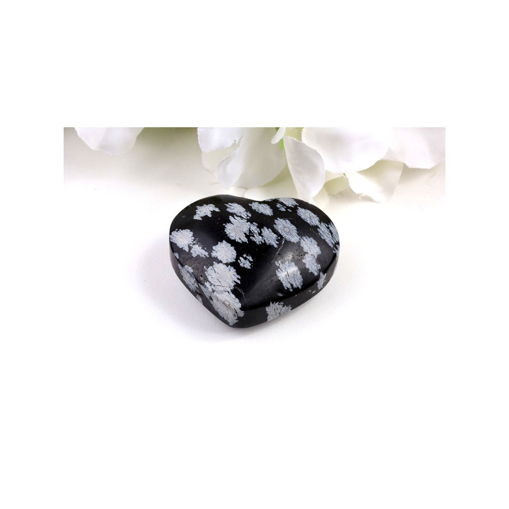 Vločkový obsidián je vulkanické sklo, které vzniká rychlým ochlazením lávy bohaté na oxid křemičitý. Charakteristické bílé vločky jsou tvořeny krystaly cristobalitu, který se vyloučil během chladnutí. Chemické složení je převážně SiO₂ s příměsí dalších minerálů. V litoterapii je vločkový obsidián znám jako kámen rovnováhy a uzemněni. Pomáhá harmonizovat tělo, mysl a duši, odstraňuje negativní energie a podporuje psychickou stabilitu. Je to silný ochranný kámen, který vytváří štít proti negativním vlivům a pomáhá rozpoznat pravdu v různých situacích. Podporuje sebereflexi, introspekci a pochopení vlastních chyb a nedostatků, což vede k osobnímu růstu.