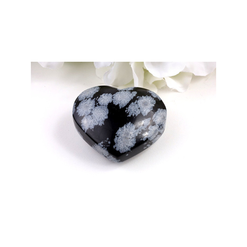 Toto nádherné srdce z vločkového obsidiánu okouzlí svou dokonalou kombinací hluboké černé barvy s nádhernými bílými vločkami, které se na jeho povrchu objevují jako jemné sněhové krystaly. Kámen je pečlivě vybroušen do romantického tvaru srdce o rozměrech 56x50x25 mm a váží 84 gramů. Povrch je leštěn do vysokého lesku, což zvýrazňuje kontrastní hru barev a dodává kameni elegantní vzhled. Struktura vločkového obsidiánu je hustá a kompaktní, s rovnoměrně rozptýlenými bílými krystaly cristobalitu, které vytvářejí charakteristický vločkový vzor. Každý kus je jedinečný a neexistují dva naprosto identické kameny.