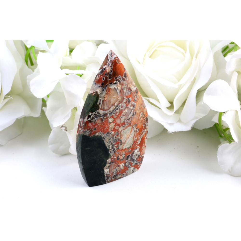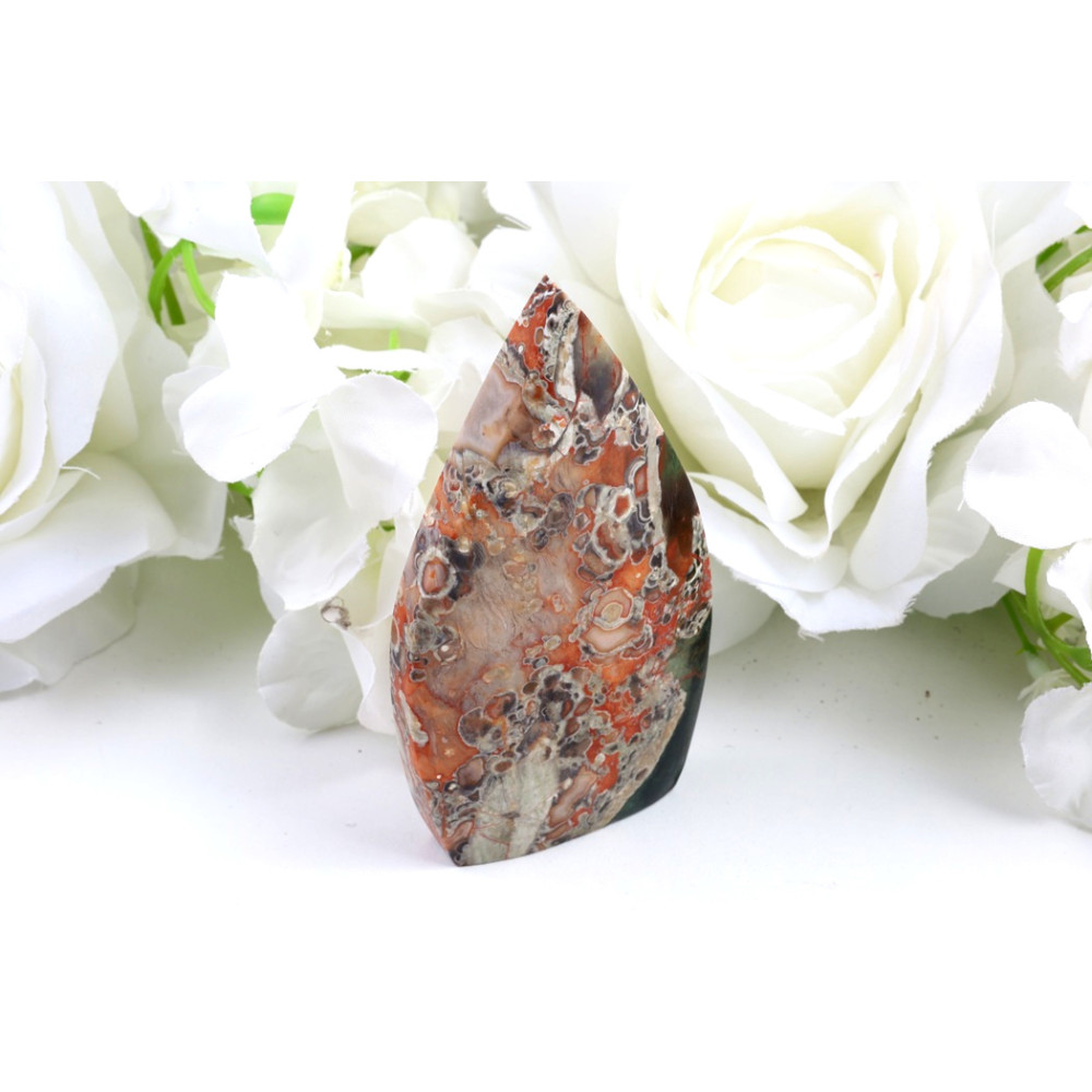 Tento konkrétní kousek penízkového achátu zaujme svou unikátní, bohatě členitou kresbou, která připomíná spletitou mapu. Převládají zde syté oranžovo-hnědé a rezavé tóny, které se prolínají s jemnějšími krémovými, šedavými a bílými "penízky" a kruhy. Povrch je dokonale hladce leštěný, což podtrhuje jeho přirozený lesk a dovoluje světlu hrát si s hlubokými barvami minerálu. Na jedné straně špice se objevuje výrazná, tmavě zelená až černá plocha, která dodává kameni zemitou hloubku a kontrastuje s teplejšími odstíny, což opticky zvýrazňuje celkovou dynamiku a individualitu kusu.