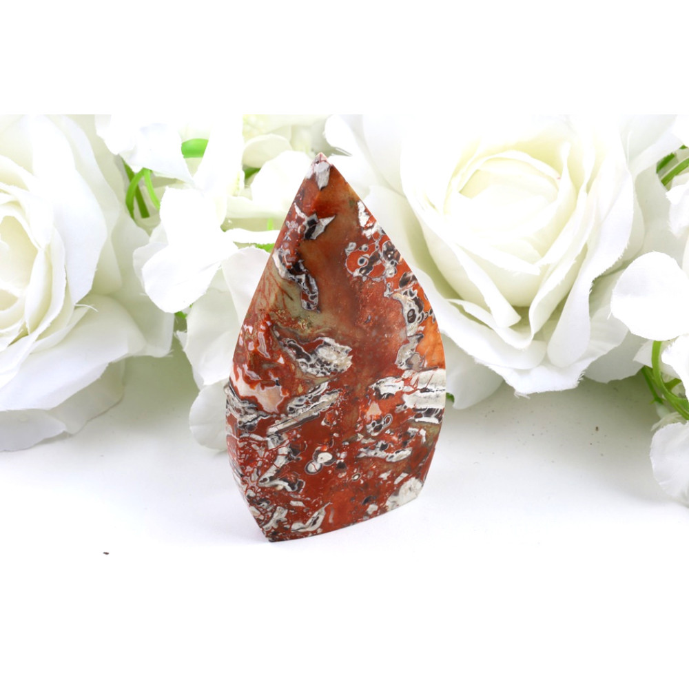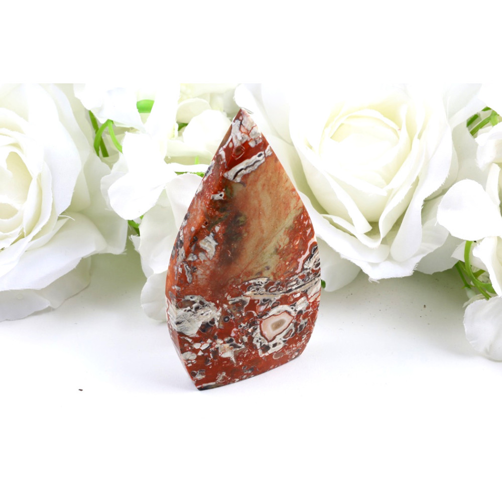 Tato nádherná špice z penízkového achátu č. 1659 okouzlí svou bohatou paletou zemitých tónů a specifickými kresbami. Na jedné straně se dominantně prolínají syté odstíny červenohnědé, připomínající podzimní listí, s bílými a šedavými inkluzemi, které vytvářejí dojem vrstevnatých „mincí“ nebo oválných útvarů s jemnými černými okraji, což je pro penízkový achát charakteristické. Na druhé straně se objevují krémovější a pískové tóny, kde jsou tyto útvary méně ostře ohraničené, ale stále vytvářejí poutavou a organickou mozaiku. Celý kus je pečlivě leštěný, což zvýrazňuje hloubku barev a propůjčuje minerálu elegantní, jemný lesk.