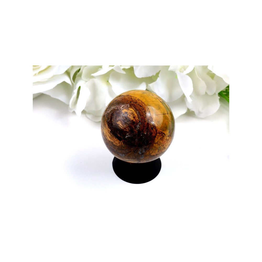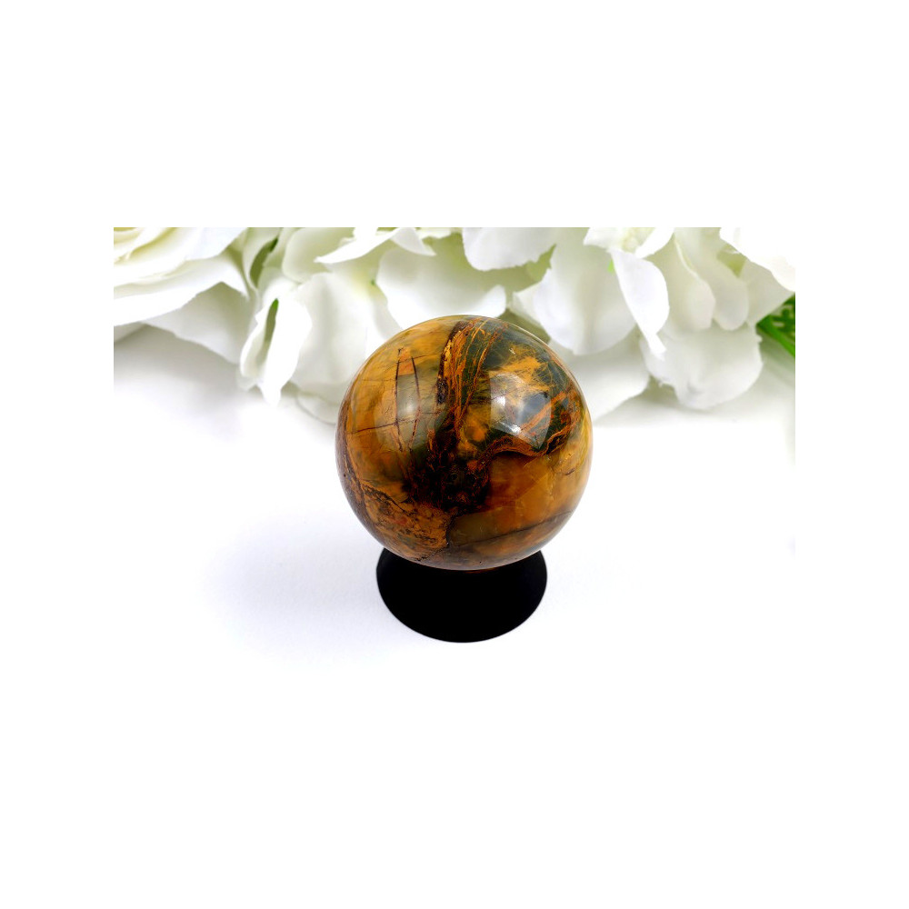 Tato exkluzivní koule Pietersit okouzlí každého milovníka minerálů svým charakteristickým "bouřkovým" vzhledem. Kámen se vyznačuje fascinující kombinací zlatavých, hnědých a šedých odstínů, které se prolínají v dynamických vlnách připomínajících bouřkové mraky. Dokonale vyleštěný povrch odhaluje chatoyantní efekt (kočičí oko), díky kterému se kámen při pohybu třpytí a mění své barevné odstíny. Vláknité struktury v kameni vytvářejí unikátní vzory, které jsou u každého kusu zcela originální. Právě tento kus je charakteristický intenzivními zlatými až jantarovými pruhy, které se střídají s hlubokými modrošedými tóny, vytvářejíce tak dramatický a energický dojem.