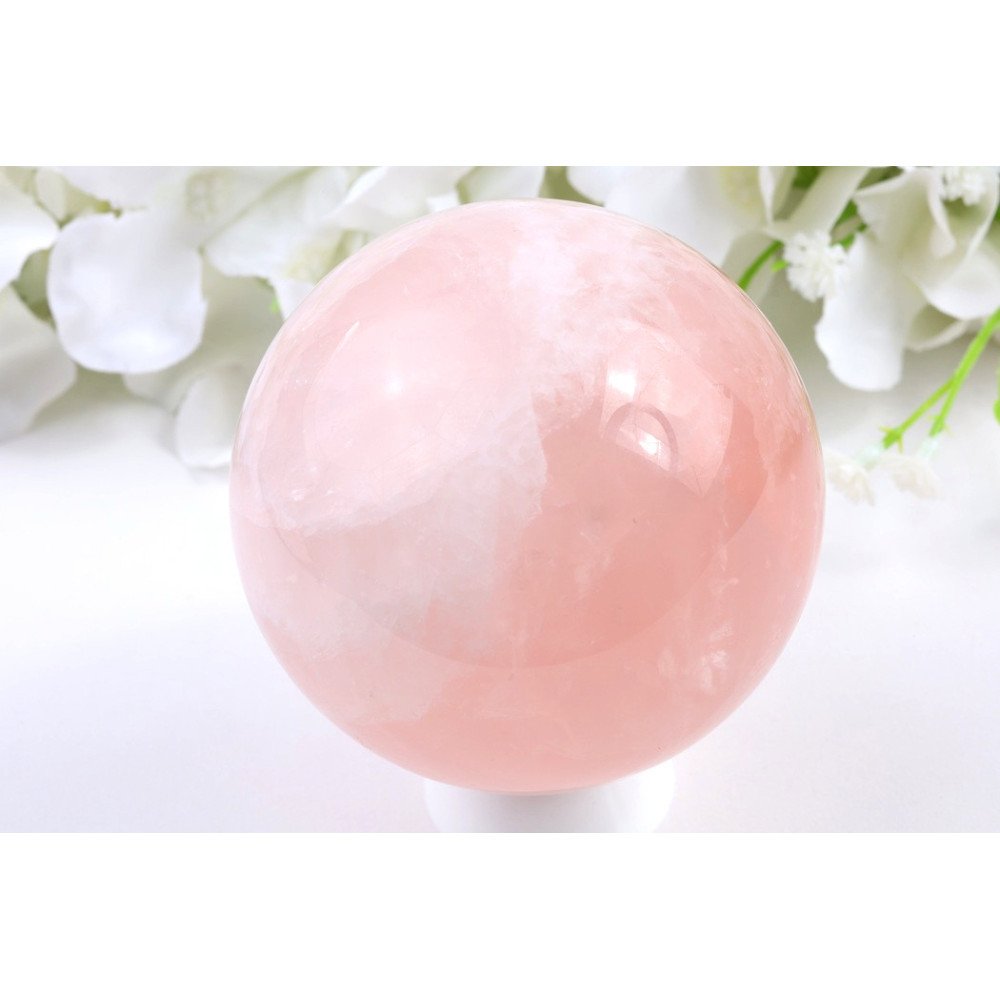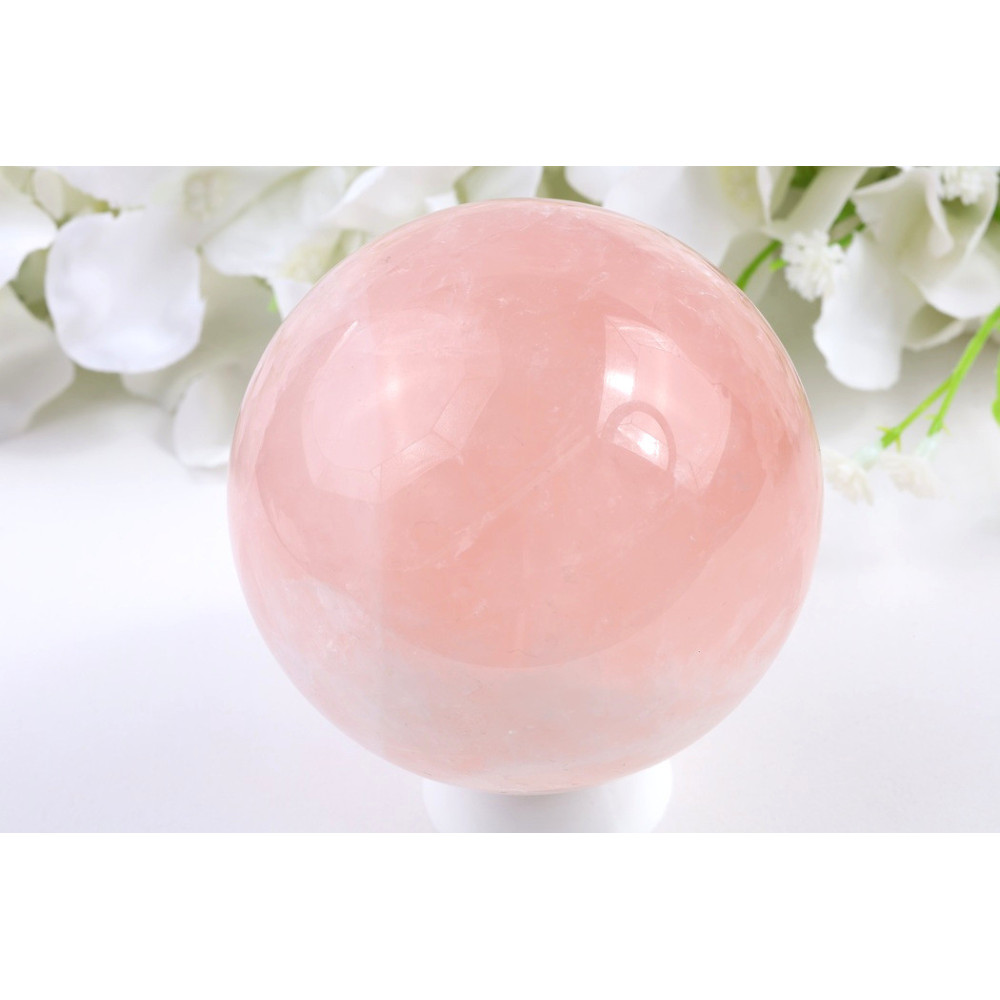Tato nádherná růženínová koule uchvátí svou jemně růžovou barvou a dokonale vyleštěným povrchem s vysokým leskem. Koule je průhledná až průsvitná, což umožňuje nahlédnout do její hloubky, kde se objevují charakteristické bílé mlžné oblaky. Struktura je čistá a hladká, bez větších vad, s jemnými přirozenými inkluzemi, které dodávají kameni autenticitu. Průsvitnost kamene vytváří zajímavou optickou hloubku a pastelová růžová barva působí uklidňujícím a něžným dojmem.