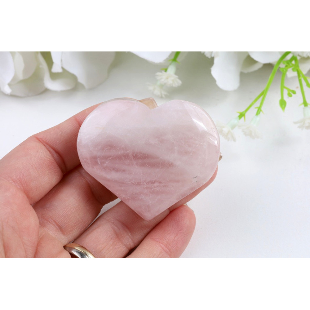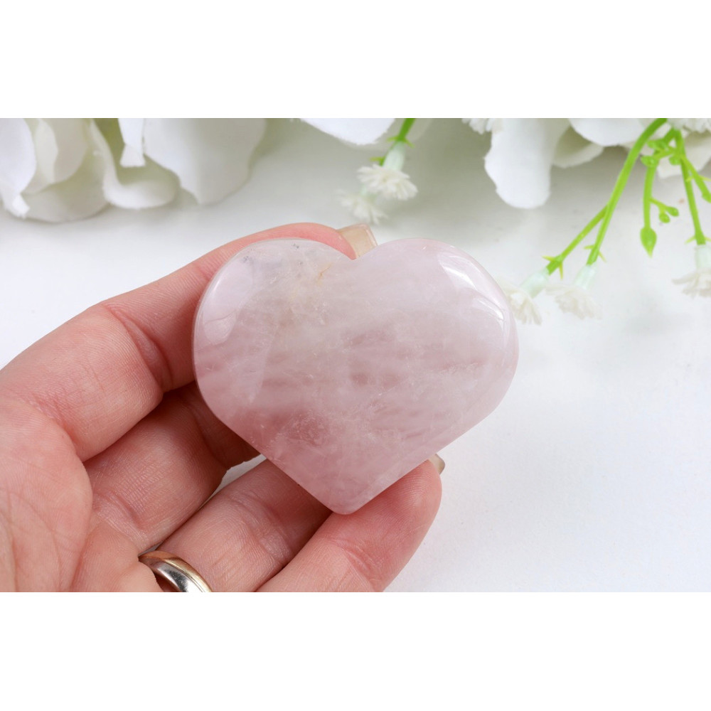 Tento krásně vybroušený růženín v symbolickém tvaru srdce vás okouzlí svou jemně růžovou, mléčnou barvou. Kámen má hladce leštěný povrch s hedvábným leskem, který příjemně odráží světlo. Jeho struktura je homogenní s jemnými světlými žílkami, které dodávají každému kusu jedinečnost. Mléčně průsvitný růženín působí něžně a uklidňujíc a, ideální pro dotyk i kontemplaci.
