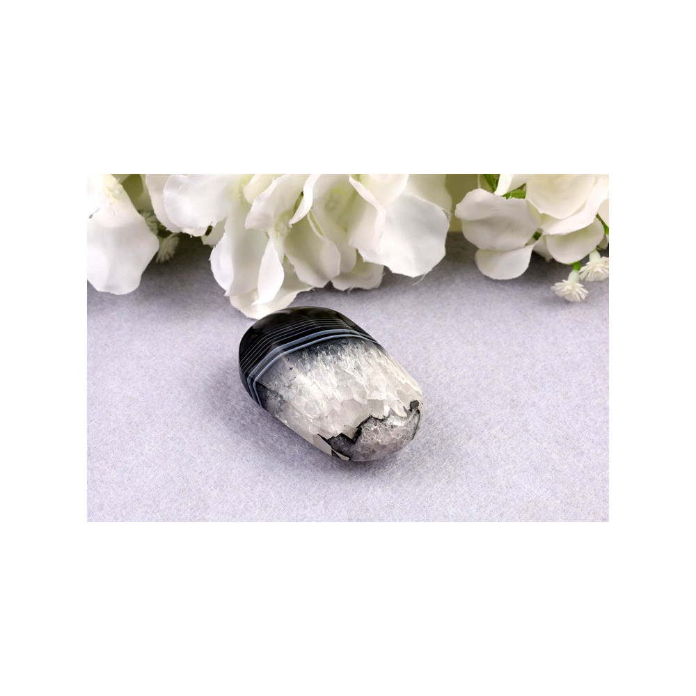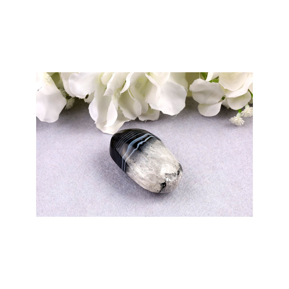 Černý sardonyx je varietou chalcedonu, křemičitého minerálu ze skupiny křemenů. Chemicky se jedná o oxid křemičitý (SiO₂) s mikrokrystalickou strukturou. Tento exemplář pochází z Brazílie, která je proslulá kvalitními nálezy sardonyxu. V litoterapii je černý sardonyx ceněn pro své ochranné a uzemňující vlastnosti. Pomáhá při zvládání stresu, posiluje sebedůvěru a podporuje vnitřní sílu. Tradičně se používá k posílení koncentrace, stability a vytrvalosti. Černý sardonyx má také harmonizující účinek na energetické pole a pomáhá při práci s kořenovou čakrou.