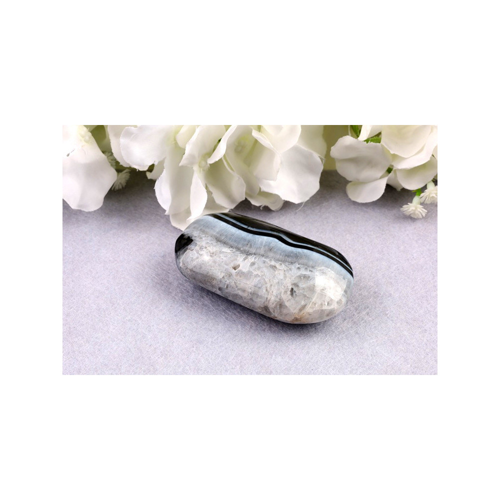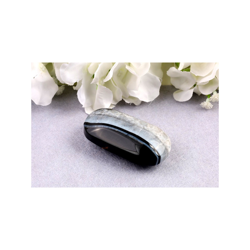 Tato masážní hmatka z černého sardonyxu zaujme svou elegantní černou barvou s jemným šedým až bílým proužkováním, které vytváří na povrchu minerálu přirozený a jedinečný vzor. Povrch je pečlivě vyleštěn na vysoký lesk, což nejen zvýrazňuje hloubku barvy a krásu vnitřních struktur, ale také zajišťuje příjemný pocit při doteku. Rozměry 71x39x24 mm a hmotnost 108 g dávají hmatce ideální velikost pro pohodlné držení v dlani během masáží nebo meditace. Černý sardonyx je odrůdou chalcedonu s charakteristickými tmavými tóny, která vyzařuje sílu a stabilitu.