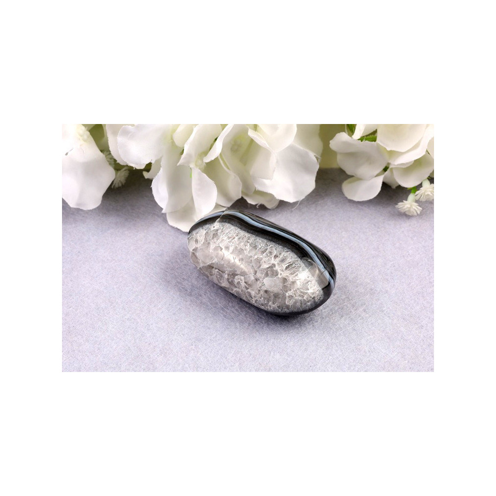 Objevte sílu a krásu černého sardonyxu v podobě dokonale vybroušené hmatky. Tento výjimečný kámen pochází z brazilských nalezišť a jeho jedinečné pruhování z něj činí skutečný přírodní skvost.