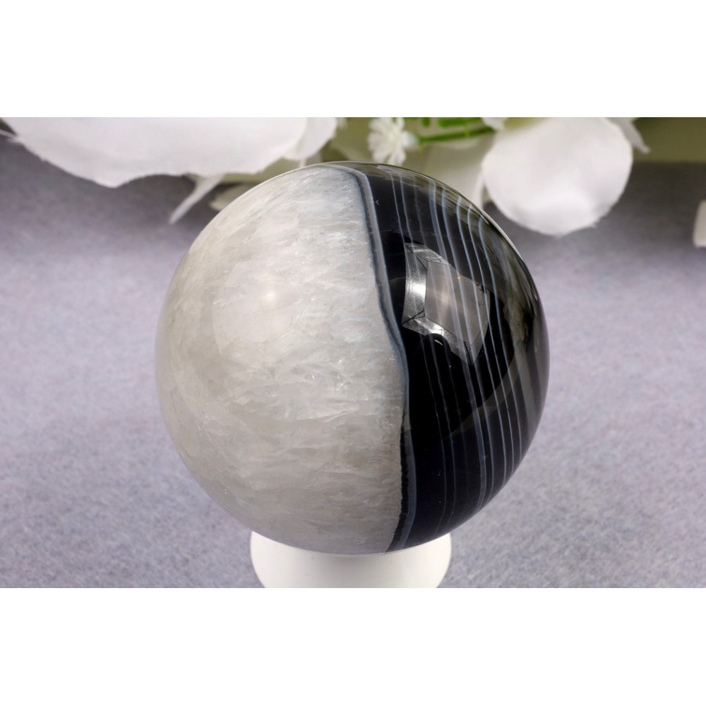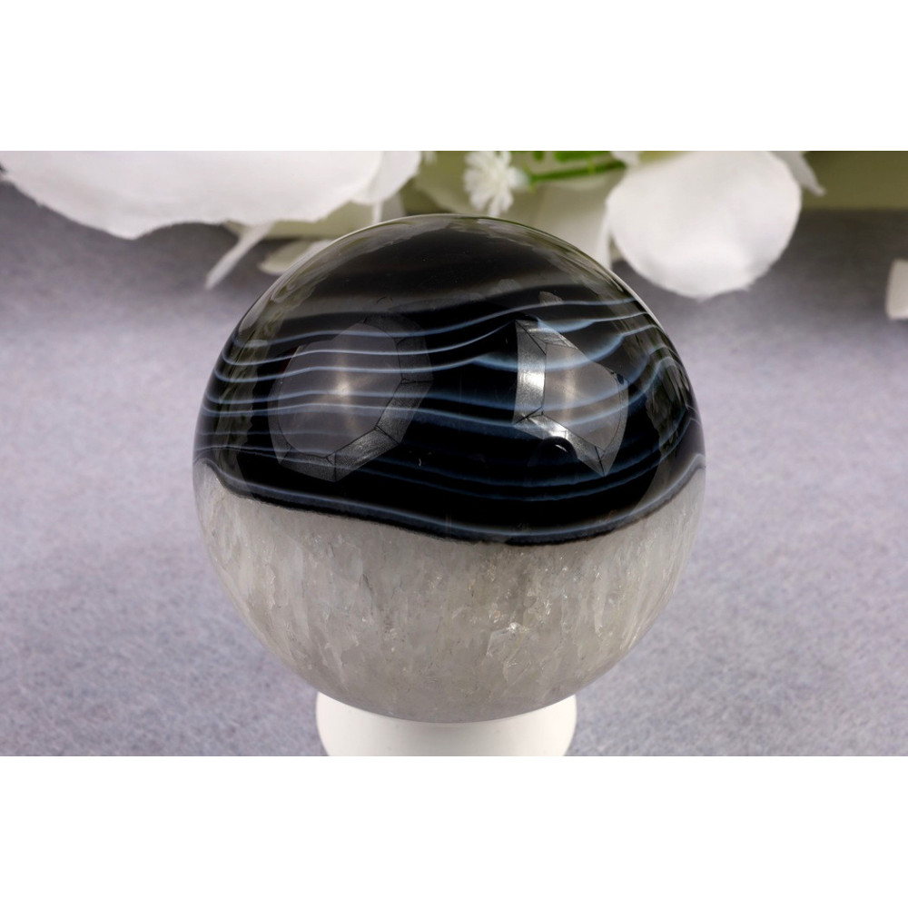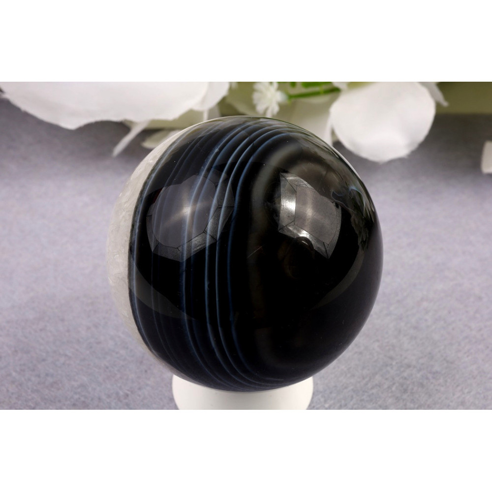 Tato černá sardonyxová koule je skutečným skvostem pro milovníky vzácných minerálů. Její elegantní tmavá krása a dokonalý lesk z ní činí unikátní kus, který okamžitě upoutá pozornost. Přidejte si tento tajemný kámen do své sbírky nebo si dopřejte kus přírody, který vás bude provázet na cestě za vnitřní harmonií.