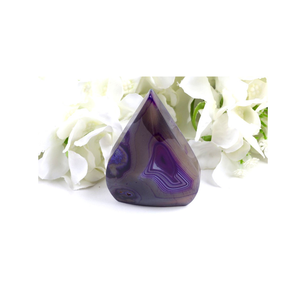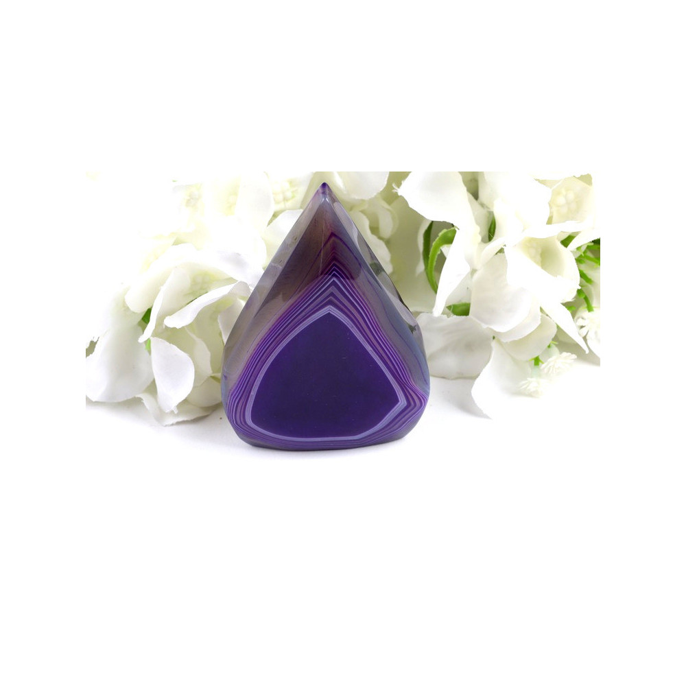Tato špice sardonyxu zaujme svou výraznou fialovou barvou s charakteristickými bílými pruhy, které vytvářejí jedinečný přírodní vzor. Kámen byl odborně vybroušen do špičatého tvaru, který symbolizuje směřování energie k vyšším úrovním vědomí. Vysoce leštěný povrch dodává kameni elegantní vzhled a umožňuje plně ocenit jeho přírodní krásu. Rozměry 86x59x25 mm a hmotnost 172 g z něj činí ideální kámen pro práci s energií i jako dekorativní prvek. Díky dobarvení je fialový odstín ještě výraznější a lákavější pro oko.