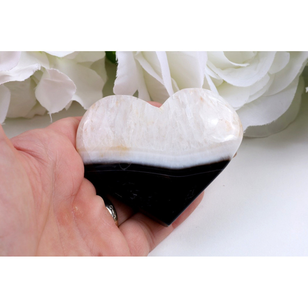 Toto elegantní srdce ze sardonyxu s unikátním dvoubarevným provedením je skutečným skvostem pro každého milovníka minerálů. Jeho kombinace světlých a tmavých tónů s vysokým leskem z něj činí výjimečný kus, který ozdobí každou sbírku i interiér. Neváhejte a pořiďte si tento jedinečný kámen z Brazílie ještě dnes.