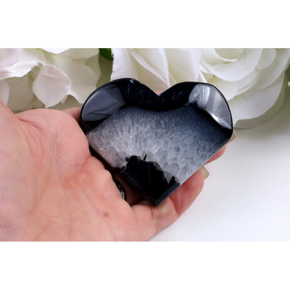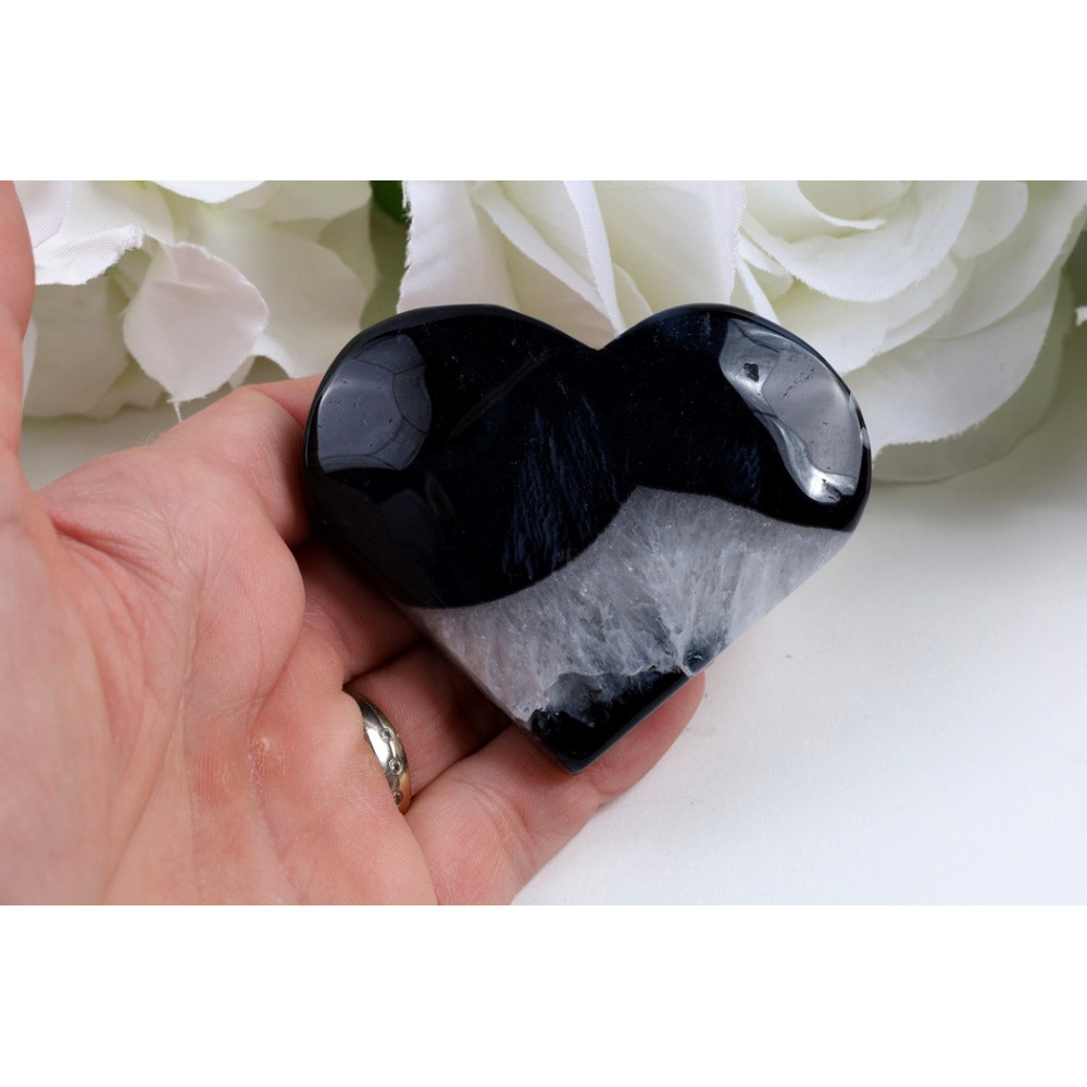 Tento nádherný kus černého sardonyxu ve tvaru srdce se vyznačuje intenzivní černou barvou, která působí luxusně a elegantně. Povrch má vysoký lesk s hladkým, lesklým povrchem, který krásně odráží světlo a zdůrazňuje symetrický tvar srdce. Kámen je precizně vybroušený s rovnoměrnou texturou a vytváří dokonalý dojem harmonického celku. Jemné zaoblené hrany podtrhují eleganci tohoto kusu.