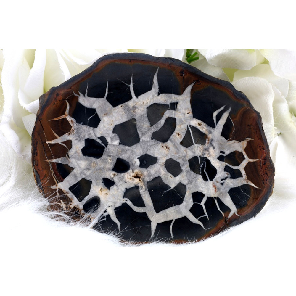 Tento konkrétní plátek Septárie č. 1372 uchvátí svým sytě hnědočerným, hladce leštěným povrchem, na kterém se rozprostírá spletitá, krémově bílá až světle šedá síť žil. Tyto žíly vytvářejí jedinečný, téměř pavučinovitý vzor, který připomíná prastaré mapy nebo zkamenělé kořeny, dávající tomuto kusu nezaměnitelný charakter. Některé světlejší části se zdají být mírně transparentní, což podtrhuje organickou krásu minerálu.