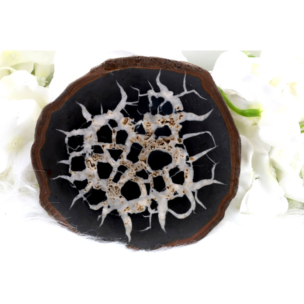 Tento nádherný plátek septárie pochází z exotického Madagaskaru, ostrova opředeného tajemstvím a bohatou geologickou historií. Zde, v prastarých sedimentech, vznikala septárie po miliony let, kdy se minerální roztoky usazovaly v puklinách a vytvářely jedinečné krystalické struktury. Každý kus je tak svědectvím o dynamických silách naší planety a cestě, kterou urazil z hlubin země až do vaší dlaně. Je to skutečný poklad, nesoucí energii dalekých a divokých krajin.