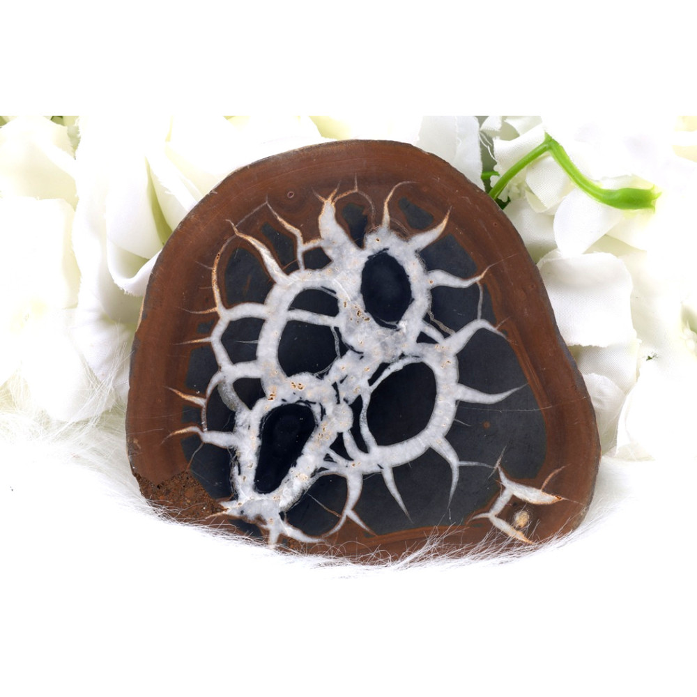 Tento konkrétní plátek Septárie č. 1379 ztělesňuje fascinující tanec přírodních sil. Jeho oválný tvar s jemně zaoblenými hranami obepíná temně hnědý, téměř čokoládový základ, který je zdoben složitou sítí krémově bílých a jemně žlutavých žilek. Tyto žilky, tvořící jakousi pavučinu nebo kořeny, se rozbíhají od centrálních dutinek, které jsou vyplněny tmavě šedým až černým materiálem. Leštěný povrch nádherně zvýrazňuje kontrast mezi hladkou, lesklou hnědou matricí a výraznými, mírně plastickými žilkami.