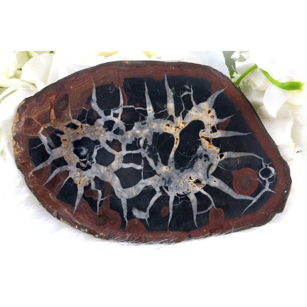 Tento plátek Septárie č. 1381 uchvátí na první pohled svou dramatickou kresbou a fascinujícím kontrastem barev. Jeho střed tvoří sytě černý až tmavě hnědý podklad, z něhož vystupují krémově bílé a světle šedé praskliny, které se větví do téměř organických, bleskovitých vzorů. Tyto světlé žilky, tvořené kalcitem a aragonitem, připomínají prastaré mapy nebo kořenový systém, prorážející tmavou hmotou jílovce. Okraje plátku jsou leštěné do teplých odstínů zemité hnědé a rezavé, místy s jemnými pruhy, které rámují centrální obrazec a dodávají celku hloubku a komplexnost.