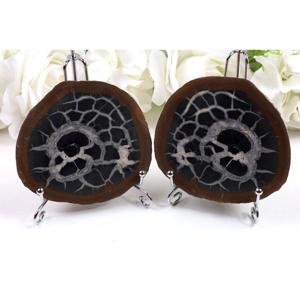 Přidejte do své sbírky tento jedinečný pár leštěných septárií z Madagaskaru. Každý kus je originál vytvořený samotnou přírodou – neexistují dva stejné. Získejte fascinující minerál, který spojuje estetiku, tradici a přírodní krásu v jednom.