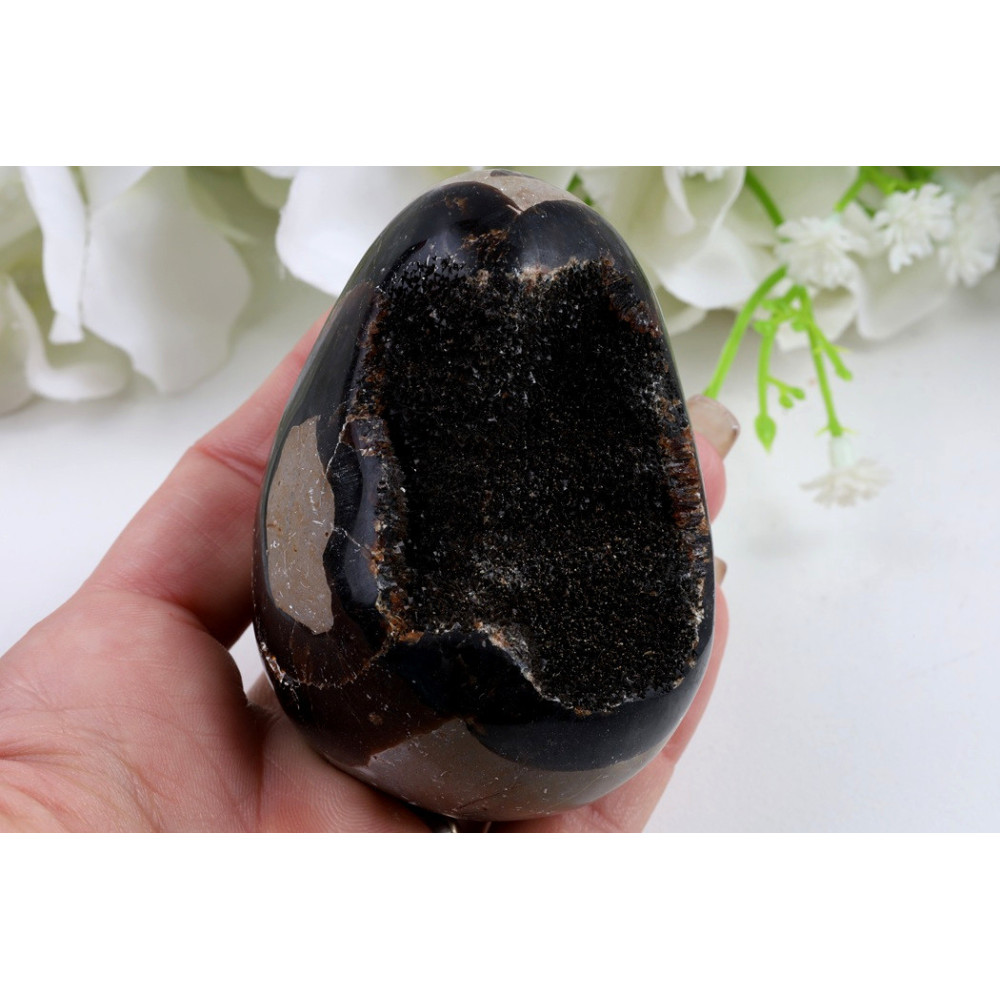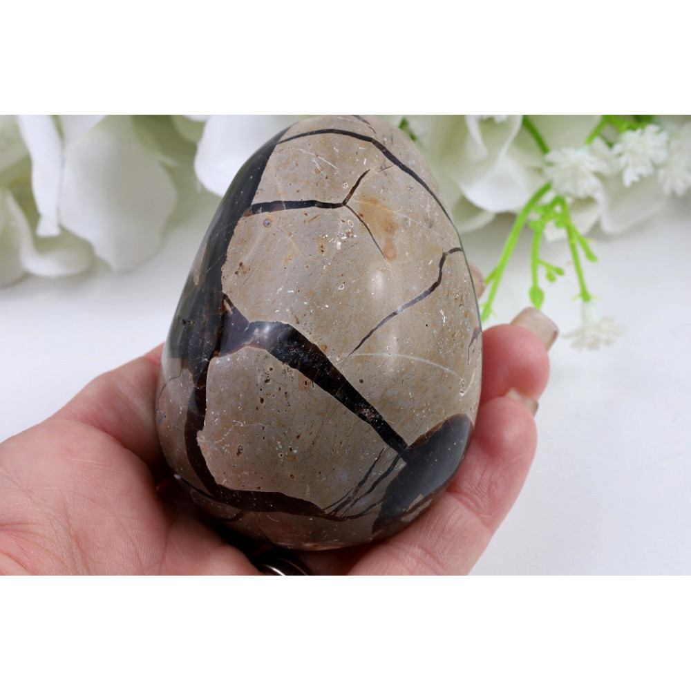 Tento nádherný kus septárie je profesionálně vyleštěn do elegantního vejčitého tvaru. Povrch kamene okouzlí svou jedinečnou kresbou - tmavě hnědá vnější kůra prošpikovaná charakteristickými puklinami vyplněnými světle žlutavými kalcitovými žilkami vytváří výrazný síťový vzor připomínající šupiny draka. Ve střední části kamene dominují šedé až béžové aragonitové partie s typickými geologickými strukturami, které se harmonicky doplňují s okrovými a zlatavými tóny kalcitu. Leštěný povrch odráží světlo a zvýrazňuje přírodní kresbu tohoto pradávného kamene z Madagaskaru.
