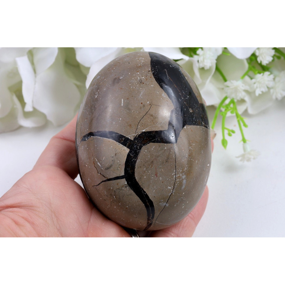 Tento jedinečný kus šeptárie má tvar elegantního vejce a vyniká svým charakteristickým vzorem, který připomíná dračí kůži. Na světle hnědém až okrovém podkladu se rozvětvují tmavé hnědé až černé praskliny vyplněné kalcitem, které vytvářejí nádhernou přírodní kresbu. Povrch je hladce vybroušený a vysoce leštěný, což zvýrazňuje barevné kontrasty a hloubku vzoru. Při bližším pohledu můžete objevit jemné detaily v kresbě, které činí každý kus naprosto jedinečným. Kámen má příjemnou hmotnost a dokonale padne do dlaně, což z něj činí ideální předmět pro meditaci nebo jako ozdobný doplněk.