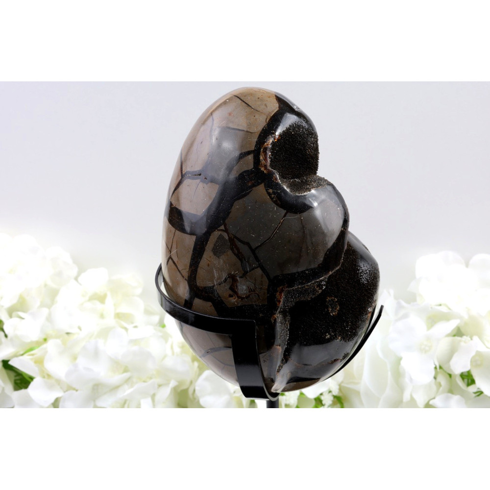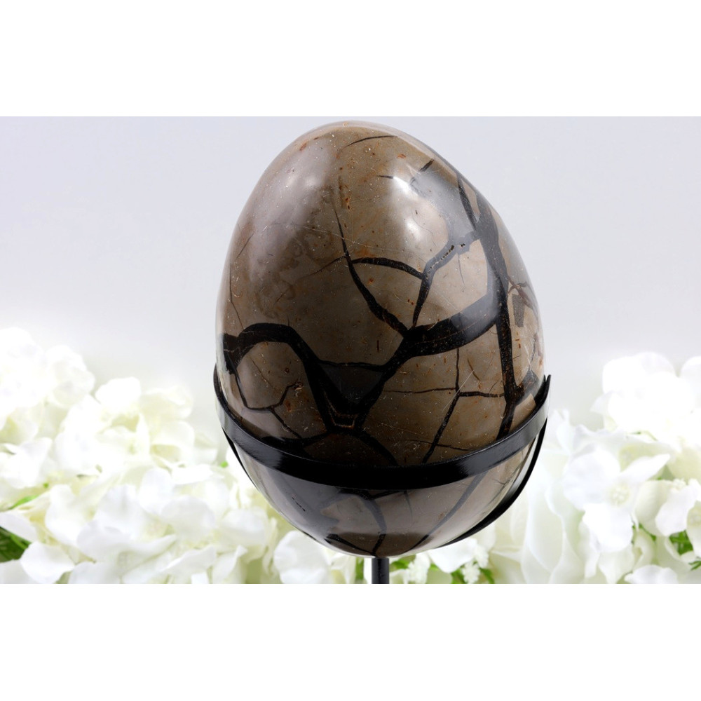Před vámi se rozprostírá mimořádně velké leštěné vejce septárie o impozantní hmotnosti přes 3 kilogramy. Povrch kamene je pečlivě vyleštěn do vysokého lesku, který zdůrazňuje dramatický kontrast mezi hluboce černou až tmavě šedou základní horninou a výraznými zlatohnědými až žluto-oranžovými kalcitovými žílami. Tyto žíly vytvářejí charakteristickou síťovitou kresbu připomínající pradávné dračí šupiny. Vejcovitý tvar je pravidelný a harmonický, každý pohled odkrývá nové detaily třpytivých mineralogických útvarů zachycených v leštěném povrchu. Kámen je dodáván včetně elegantního stojánku, který umožňuje stabilní prezentaci této vzácné přírodní skvostnosti.