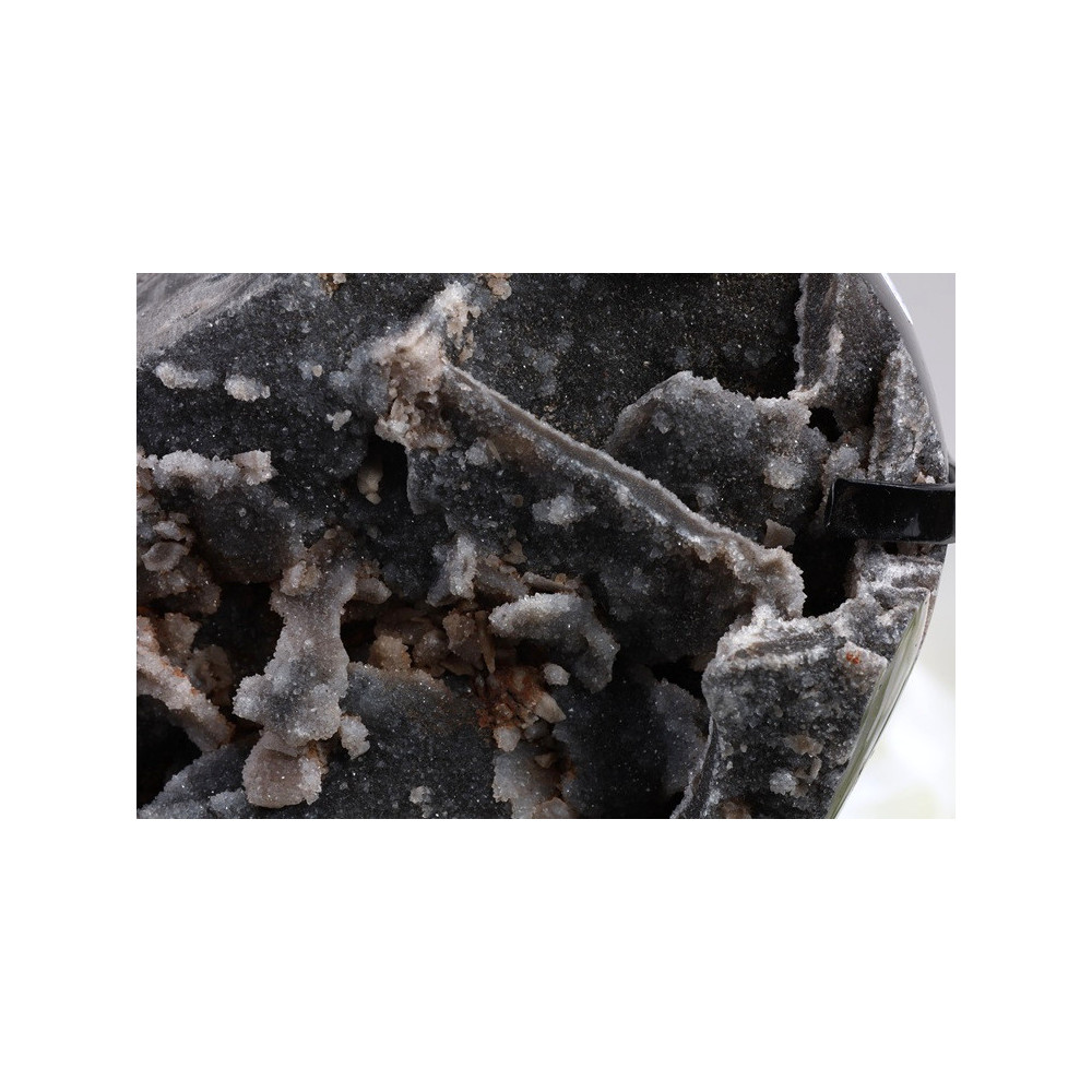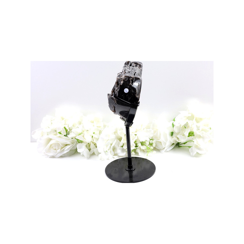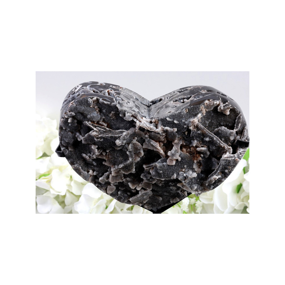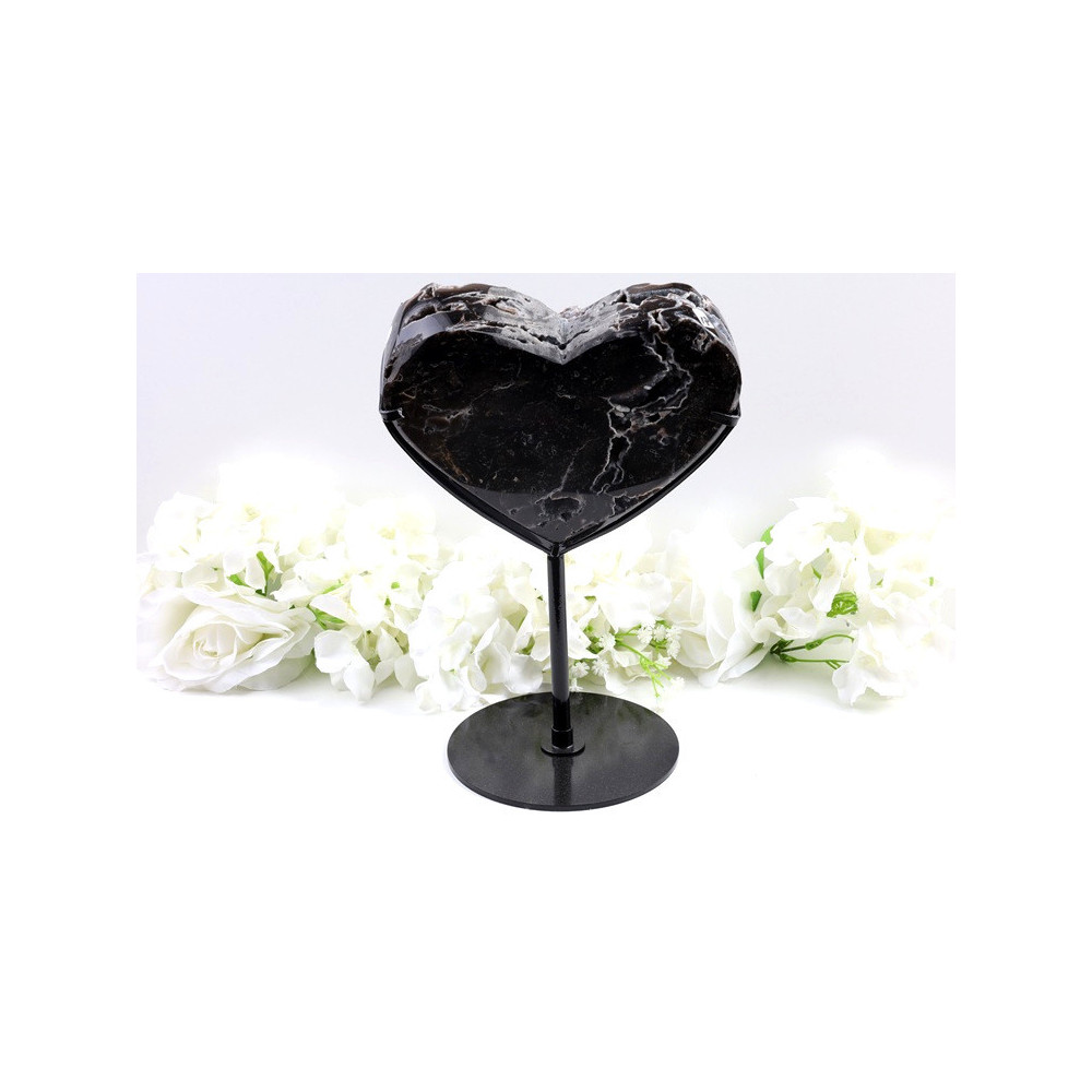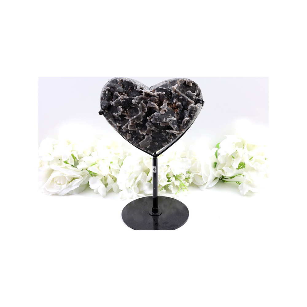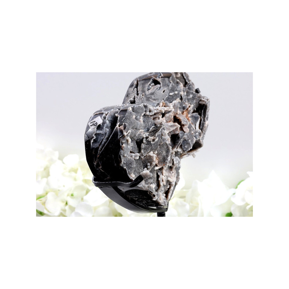 Tento velkolepý kus sfaleritu ve tvaru srdce upoutá svou tmavou, téměř černou barvou s jemným kovovým leskem. Povrch minerálu je částečně přírodní s viditelnou krystalickou strukturou, částečně vyhlazený, což vytváří zajímavý kontrast mezi surovostью přírodního kamene a jemným leskem. Minerál je upevněn na elegantním černém kovovém stojánku, který zvýrazňuje jeho masivní tvar srdce. Díky své velikosti a mohutnosti působí jako dominantní dekorativní prvek, který přitahuje pohledy svou přírodní krásou a jedinečným charakterem.