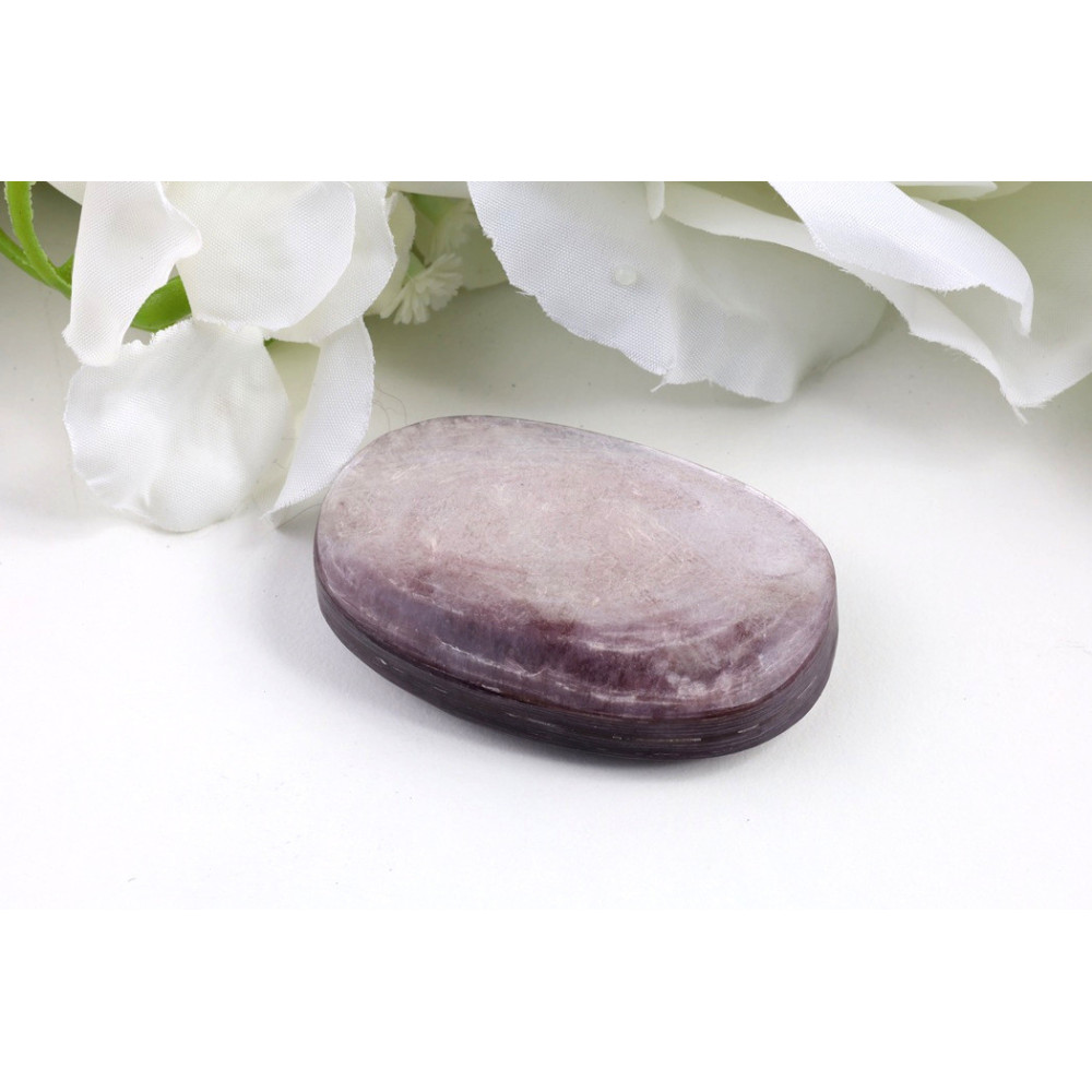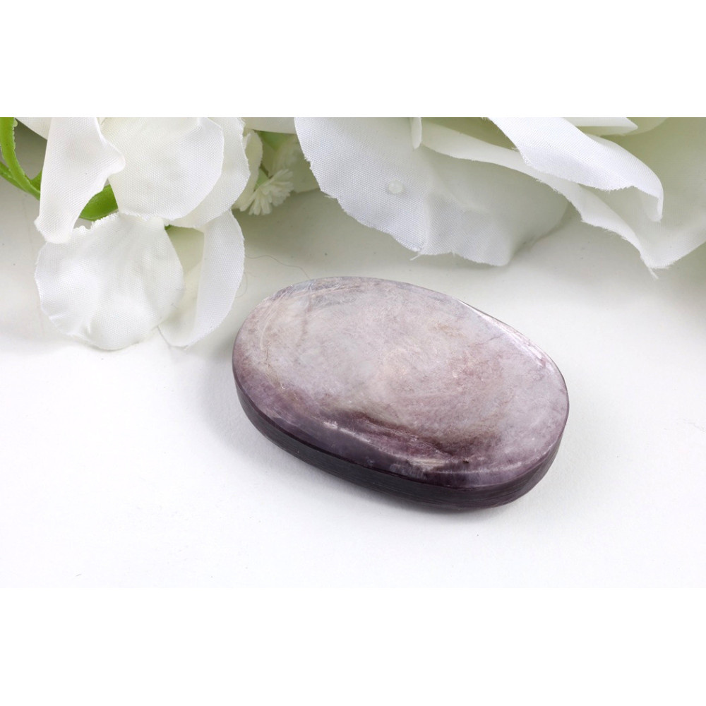 Tento nádherný kus fialové slídy zaujme na první pohled svou jemnou růžově-fialovou barvou, která přechází v různých odstínech a vytváří působivý barevný efekt. Povrch kamene má charakteristický lesklý, zrcadlově hladký metalický odlesk, který odráží světlo a dodává minerálu luxusní vzhled. Kámen má příjemný oválný tvar s kompaktní strukturou a hladkými okraji. Vrstevnatá struktura typická pro slídu je zde krásně patrná, což podtrhuje přirozenou krásu tohoto minerálu. Jeho příjemná hmotnost a velikost z něj činí ideální kámen pro držení v ruce během meditace.