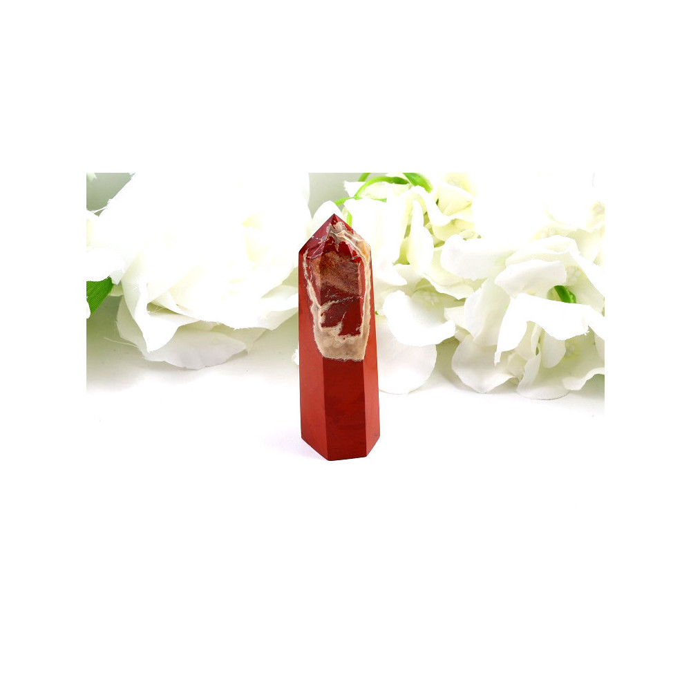 Tento působivý obelisk z červeného jaspisu přitahuje pozornost svou výraznou sytě červenou až cihlově červenou barvou, která je charakteristická pro tento mocný minerál. Kámen byl pečlivě vybroušen do klasického obeliskového tvaru s hexagonální špicí, která dodává produktu elegantní a majestátní vzhled. Povrch je dokonale vyleštěn do vysokého lesku, který odhaluje přirozenou strukturu kamene s jemnými tmavšími žilkami a překrásnou texturou. S výškou 93 mm a širokým základem 30×26 mm se jedná o impozantní kus s hmotností 123 gramů, který má silnou přítomnost a stabilitu. Každý detail tohoto obelisku svědčí o precizním řemeslném zpracování a kvalitě materiálu.